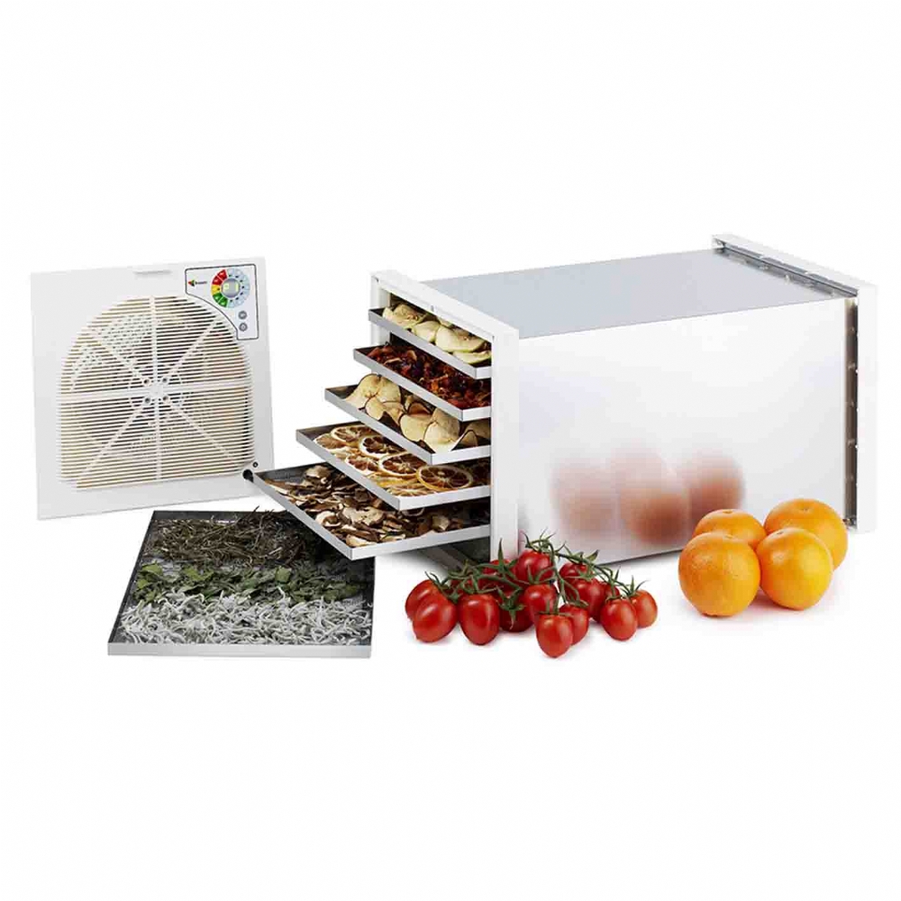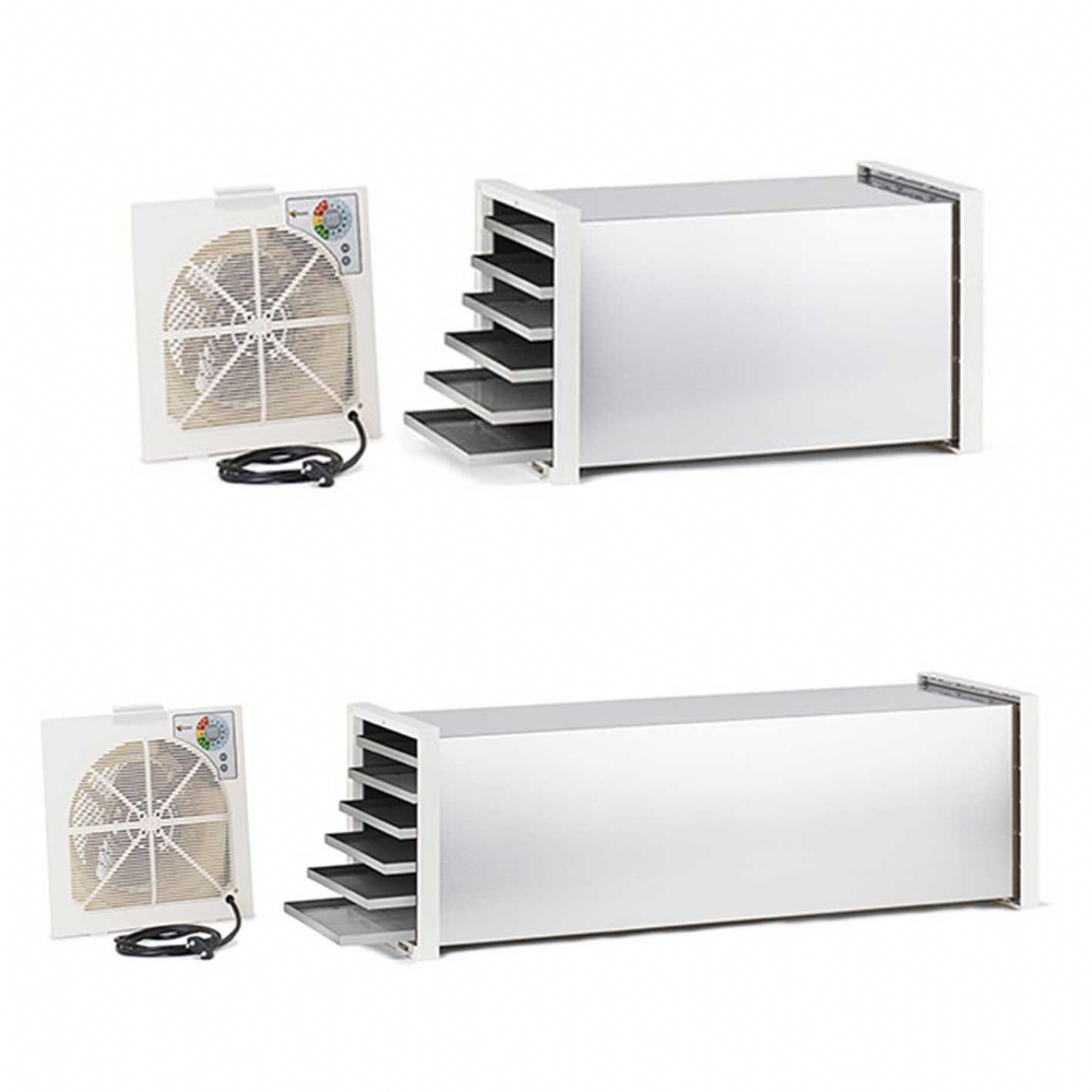 Essiccatori per Pasta Fresca e Alimenti Biosec De Luxe B6 in acciaio inox della Tauro Essiccatori sono il top della gamma e sono inoltre adatti per essiccare funghi, frutta e vedura in modo naturale. Questooriginaleessiccatoio professionale per pasta fatta in casa e alimenti è dotato di tunnel e sei cestelli interamente costruiti in acciaio inox. La Linea Biosec De Luxe si rivolge agli utenti professionali, per i quali l'acciaio inox è indispensabile e agli appasionati che desiderano possedere il meglio. Inoltre grazie ai controlli elettronici del motore Dryset Pro ogni prodotto ha un suo programma di essiccazione ottimizzato e specifico. L'utilizzo è facilissimo, basta infatti caricare i prodotti nei cestelli, selezionare il programma desiderato e Biosec si occupa di essiccare ogni alimento nel modo migliore. Durante il processo di essiccazione si può in ogni momento controllare la temperatura interna, e quando il programma è terminato il sistema Dryset Pro mantiene i prodotti al giusto grado di essiccazione, per tutto il tempo necessario. Quello che rende l'essiccatore Biosec unico è il metodo di essiccazione a flusso d'aria orizzontale. L'aria è libera di circolare lungo tutta la superficie dei prodotti, rendendo l'essiccazione uniforme e ottimizzando lo sfruttamento del calore. I modelli Biosec De Luxe vengono forniti con lo stesso gruppo motore di tutti gli altri modelli, e quindi con opzioni e programmi identici ai suoi fratelli maggiori.