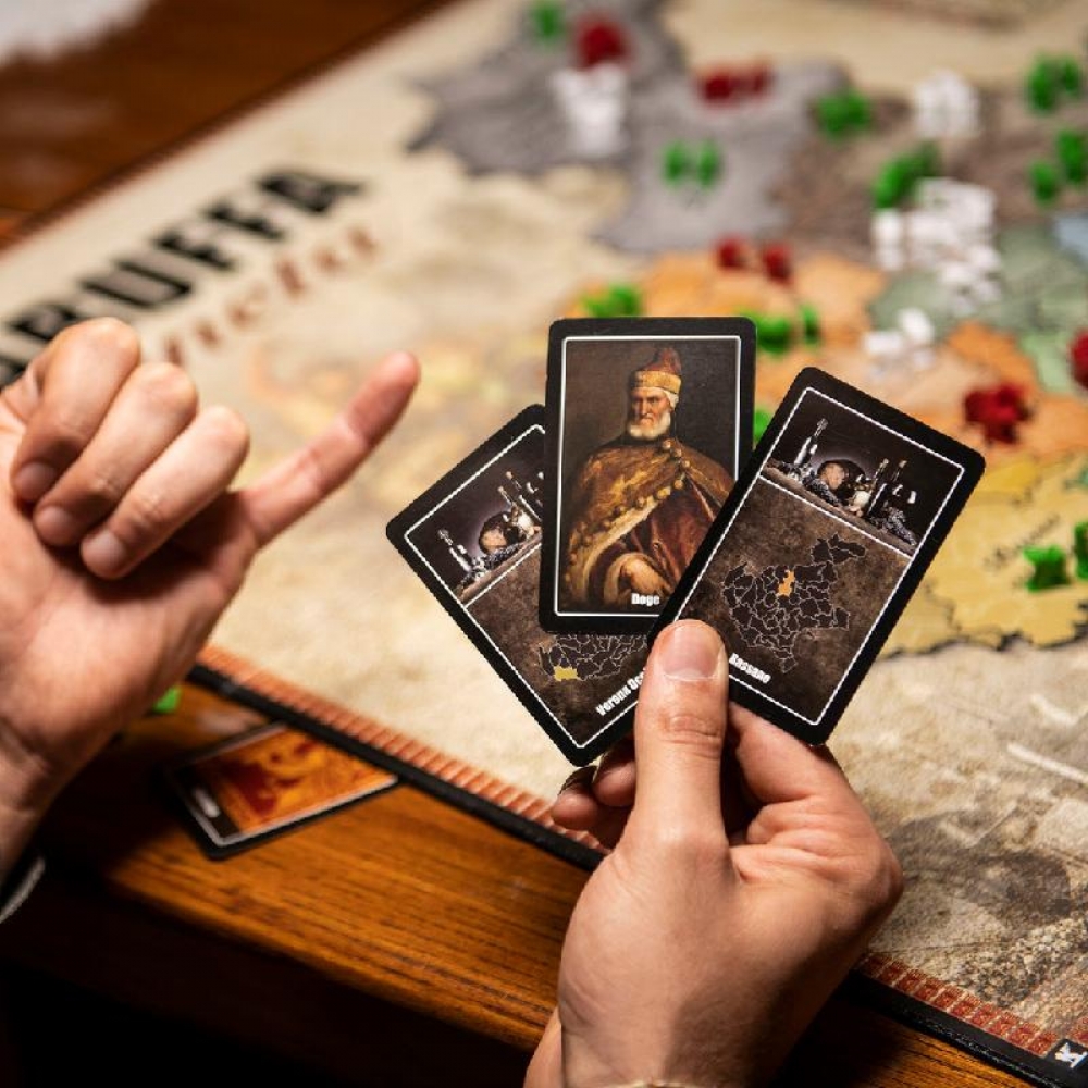 La Baruffa Veneta Gioco da tavola di Strategia del Veneto da 3 a 6 giocatori La modalità di gioco base “Baruffa classica” è molto simile al famoso “Risiko”, sarà quindi molto semplice per chi ha un'idea anche sommaria del famoso gioco di strategia avvicinarsi al mondo della “Baruffa Veneta”. Il gioco è composto da: un tabellone di 66x66 cm raffrigurante il Veneto, suddiviso in 42 possedimenti che formano le 7 Province della Regione 6 dadi (3 di attacco e 3 di difesa) una riserva di pedine, raffiguranti leoni marciani e gonfaloni di San Marco, di 6 colori diversi, una per ciascun giocatore 4 mazzi di carte (Possedimento, Obiettivo, Evento, Eccellenza) che permettono diverse modalità di gioco Questa modalità è per 3-6 giocatori, ciascuno con i suoi Possedimenti, la propria scorta di leoni marciani e gonfaloni ed il proprio obiettivo. Le fasi di gioco, scandite dal “Mona Importante”, sono 3: reclutamento, attacco/difesa, disclocamento. Come nel Risiko, controllando tutti i possedimenti che formano una Provincia si ottengono dei bonus di leoni marciani; le carte Possedimento pescate durante la gara consentono di realizzare delle combo che danno diritto a leoni marciani extra. Il gioco può essere reso più imprevedibile dall'utilizzo di carte “Evento” , carte che contengono curiosità, avvenimenti storici o semplici imprevisti e che ti faranno conoscere un sacco di cose interessanti del Veneto! Ti senti un grande stratega e cerchi una modalità di gioco meno aleatoria? Vuoi mettere un limite di tempo alla “Baruffa”? Ecco per te la modalità di gioco “Eccellenza”, che ti permetterà di giocare, divertirti e rovinare amicizie scoprendo anche le eccellenze per cui il Veneto è famoso! Qui puoi trovare anche ottimi consigli per una gita fuori porta... sempre se dopo il gioco qualcuno vorrà venire con te! Siete rimasti solo in 2 perché avete già baruffato con tutti gli altri giocatori? Vuoi sfidare tua moglie/tuo marito in singolar tenzone? Vuoi regolare i conti con il tuo fratellino rompiscatole? Cerchi un modo semplice per stabilire chi tra te e il tuo coinquilino deve lavare i piatti questa settimana? Duella con lui/lei nella modalità “Signoria” per 2 giocatori!* |