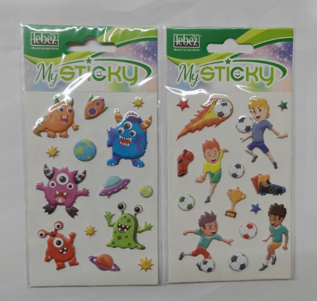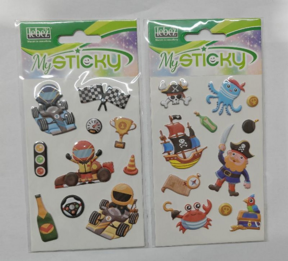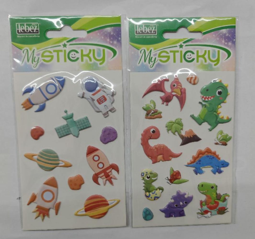 Set Adesivi Gommati 3D My Sticky Lebez Fantasia Spazio Formula 1 Pirati Calcio Mostri Dinosauri Gli adesivi rappresentano vari elementi legati al mondo dello spazio, della formula 1, dei pirati, del calcio e dei mostri.
