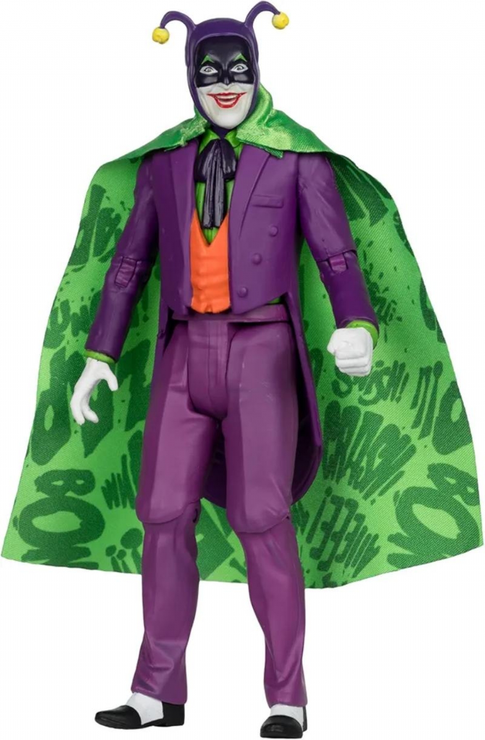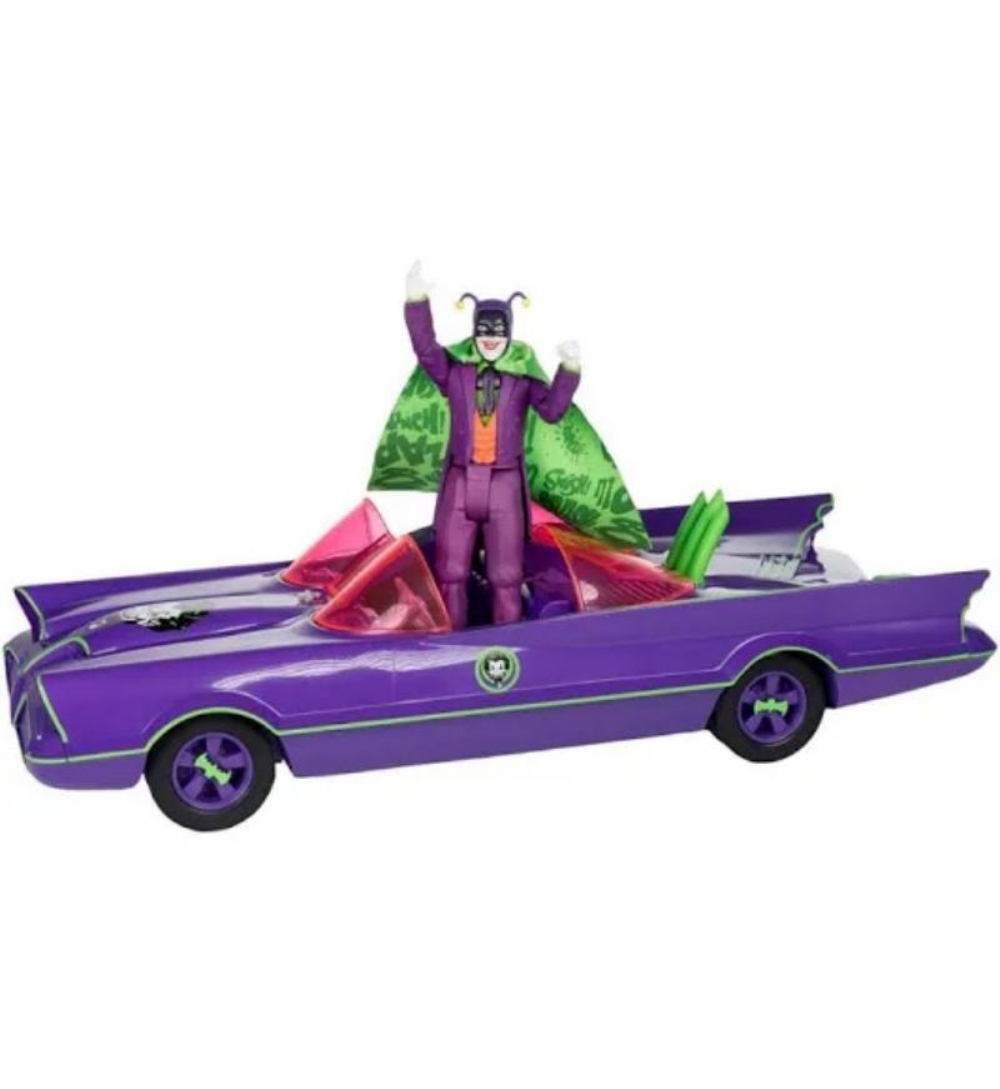 Batmobile con Joker Gold Label DC Retro Action Figure con Veicolo Batman 66 McFarlane Toys Il veicolo è basato sul design iconico della Batmobile del 1966, originariamente una concept car Lincoln Futura del 1955. Questa versione presenta una combinazione di colori viola e verde, con il volto del Joker sul cofano e loghi del Joker sui lati. Il set include un'action figure del Joker altamente dettagliata nel suo classico abito viola e verde, che si adatta all'interno del veicolo biposto. Il veicolo è compatibile con le action figure McFarlane Toys DC |