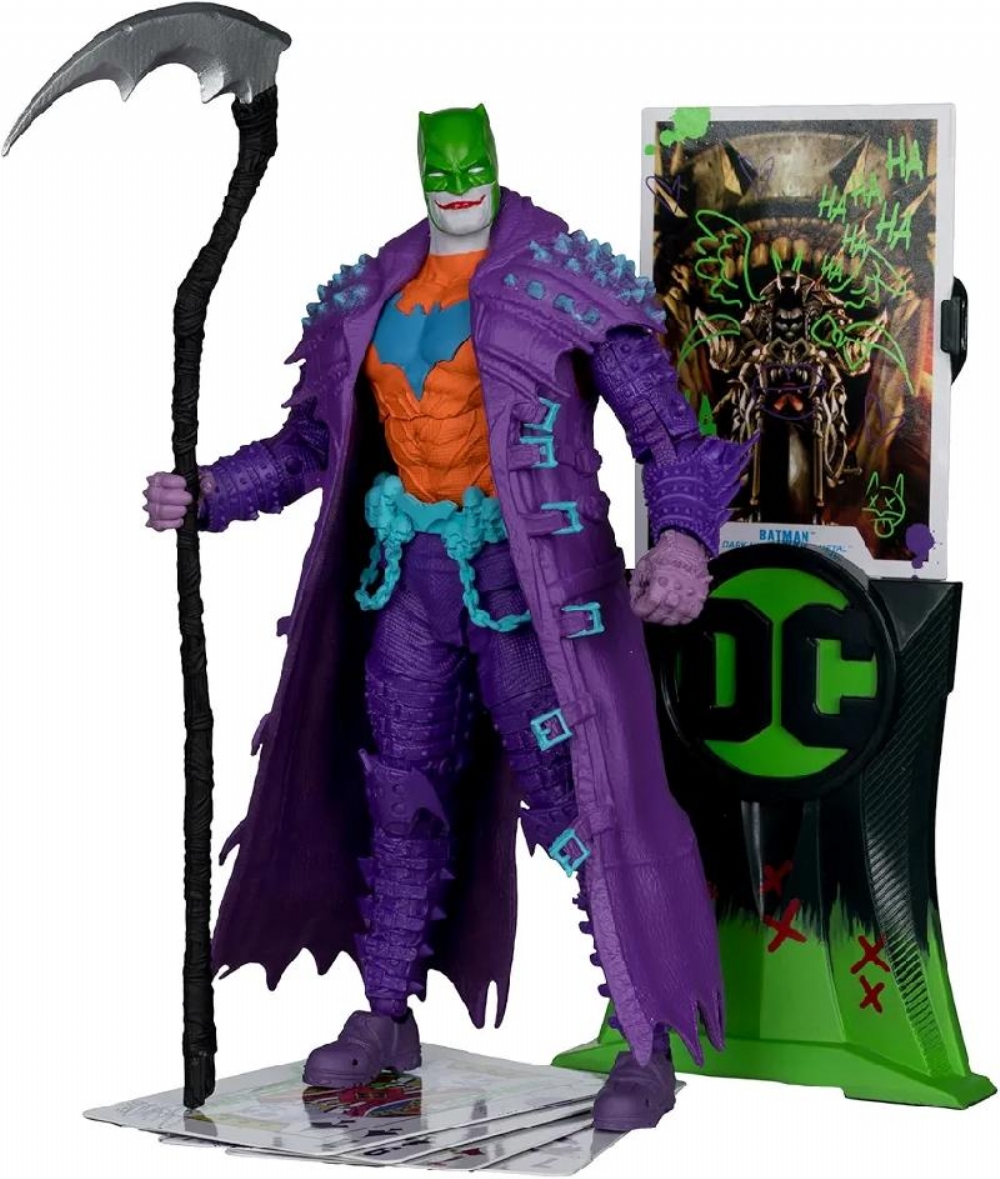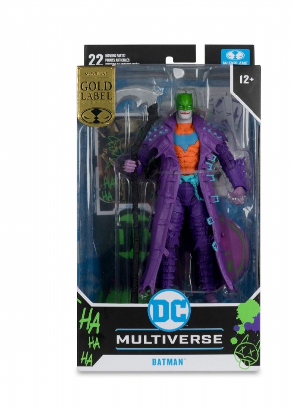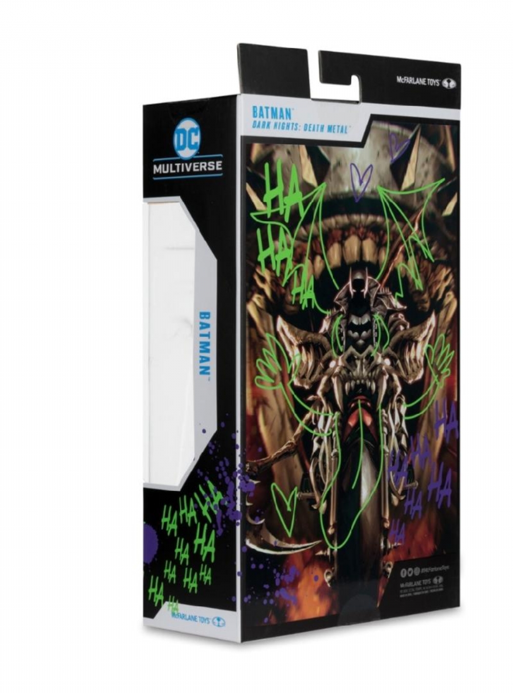 Batman Jokerizzato Dark Night Death Metal Action Figure Gold Label DC Multiverse 18cm McFarlane Toys In seguito agli eventi sconvolgenti di Dark Nights: Metal, la Terra è avvolta dal Multiverso Oscuro e si è trasformata in un paesaggio infernale, distorto e irriconoscibile. Disposto a sacrificare la propria umanità per il bene superiore, Batman brandisce un malvagio anello del potere di Lanterna Nera, che gli conferisce il potere di resuscitare i morti. Ora, a capo di un esercito di zombie e a bordo di un Batciclo fatto di ossa, il Cavaliere Oscuro dichiara guerra al Batman che Ride e alla sua onnipotente dea, Perpetua, nella sua missione per salvare il Multiverso DC! - Figure da 18 cm incredibilmente dettagliate, basate sul Multiverso DC
