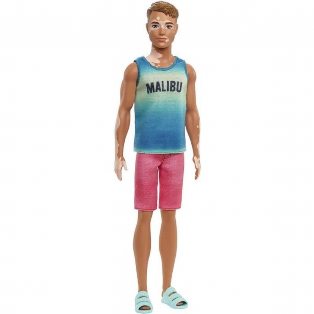Barbie Ken Fashionistas Capelli Castani Corti 192 DWK44 HBV26 Ken Fashionistas Bambola n. 192, Capelli castani Corti, vitiligine, Canotta con Scritta Malibu Le bambole Ken Fashionistas sono davvero irresistibili con i loro