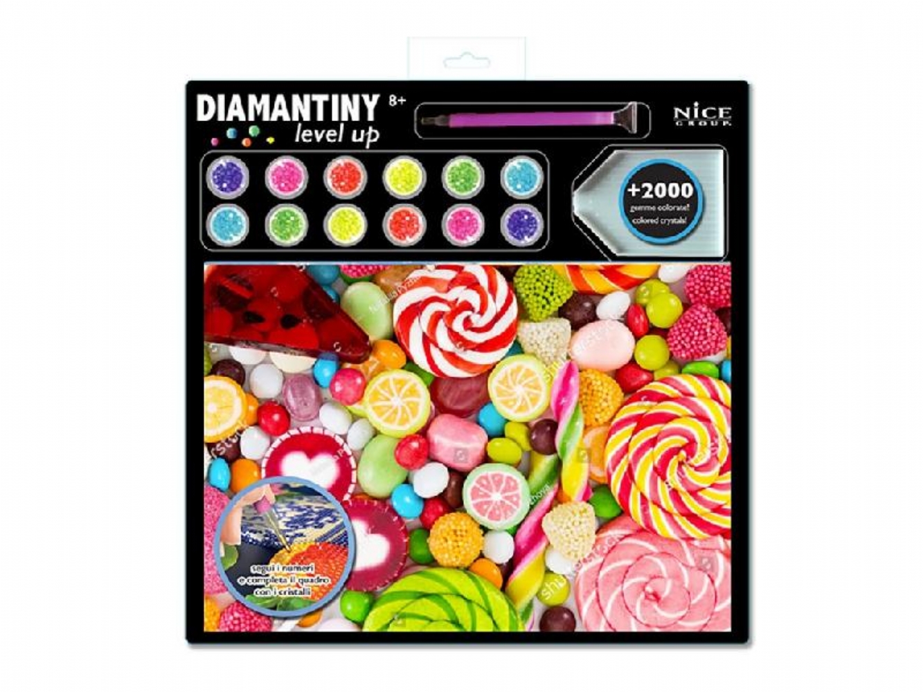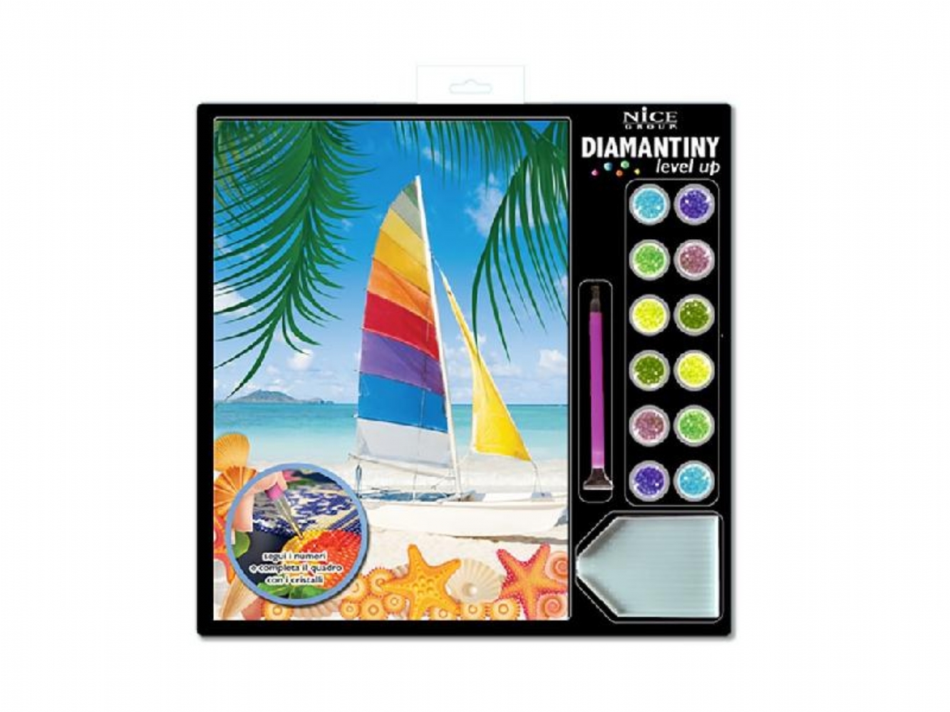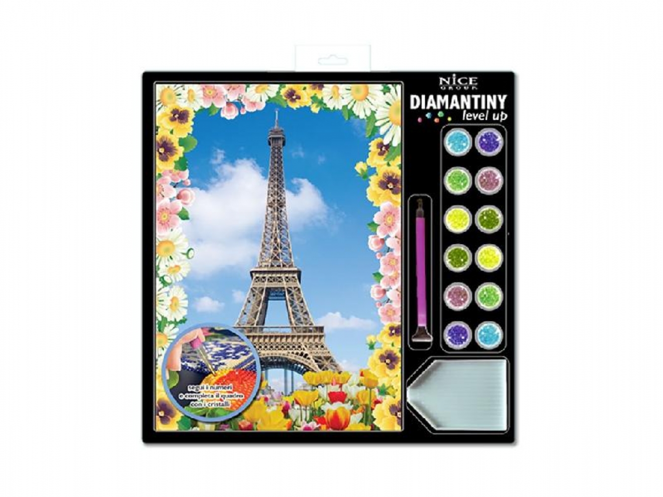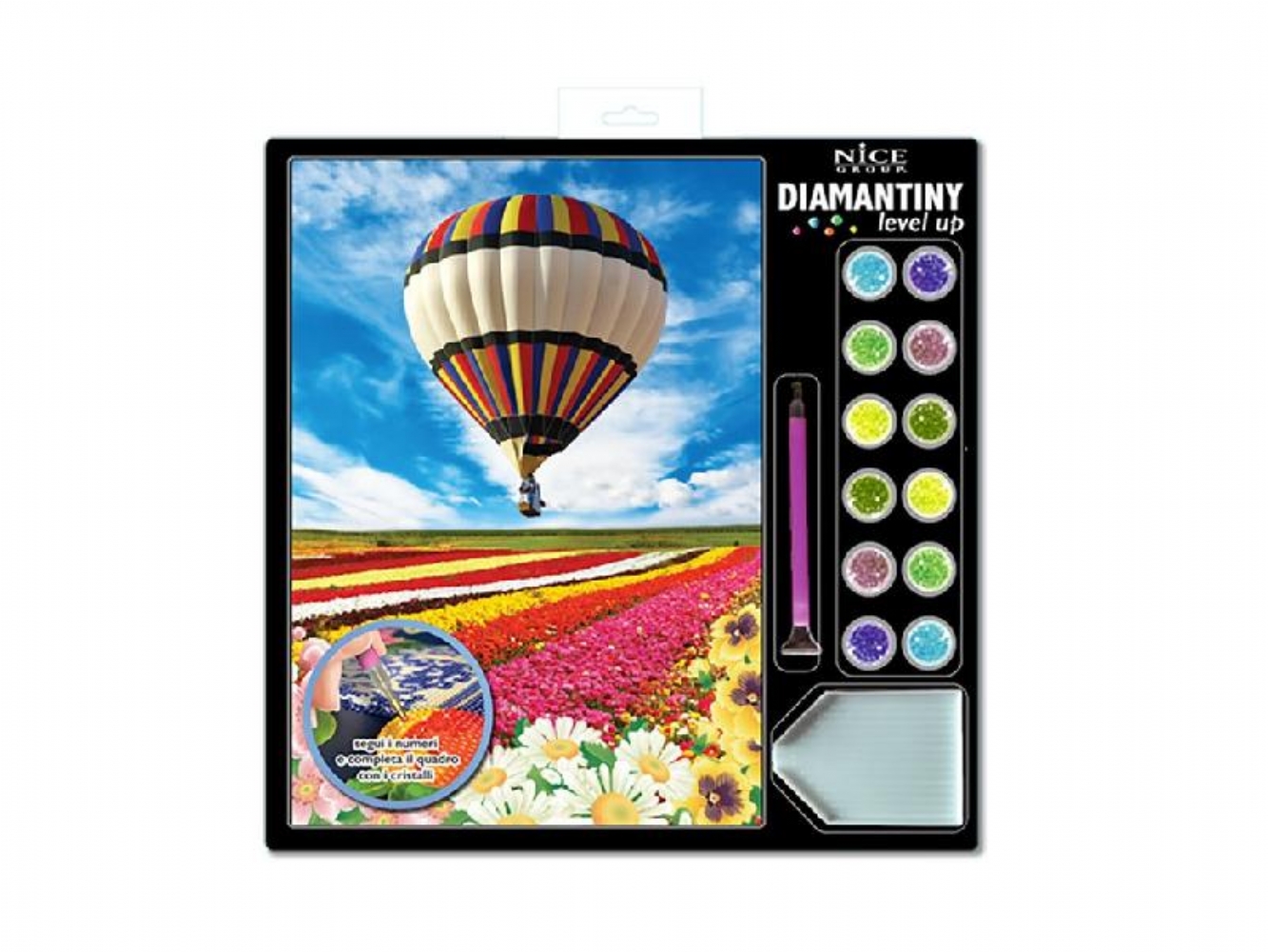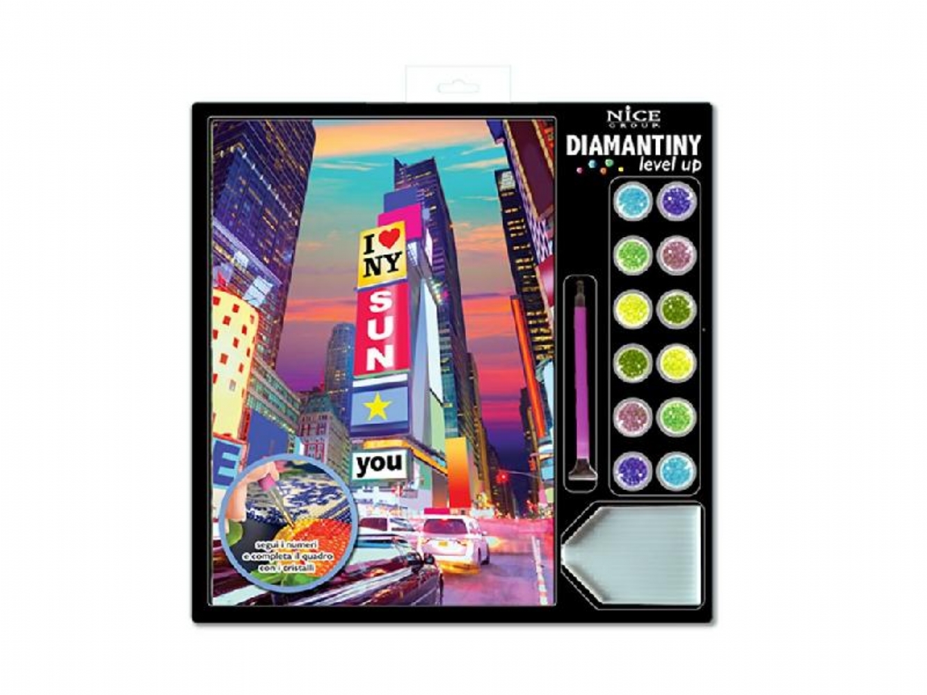 Diamantiny Level Up kit Creativo Mosaici Gemme Colorate 3D Paesaggi Vari È un'attività fai-da-te che aiuta a sviluppare la manualità, la coordinazione e la concentrazione. Il kit include un quadretto con base adesiva e una guida colore, oltre a migliaia di cristalli colorati, una penna applicatrice, un vassoio e un quadratino di cera. Per realizzare il mosaico, si applicano le gemme colorate sui numeri corrispondenti sul quadretto adesivo. È un prodotto adatto a bambini dagli 8 anni in su. Disponibile quadretto: - New York - Torre Eiffel - Barca a vela - Mongolfiera - Caramelle