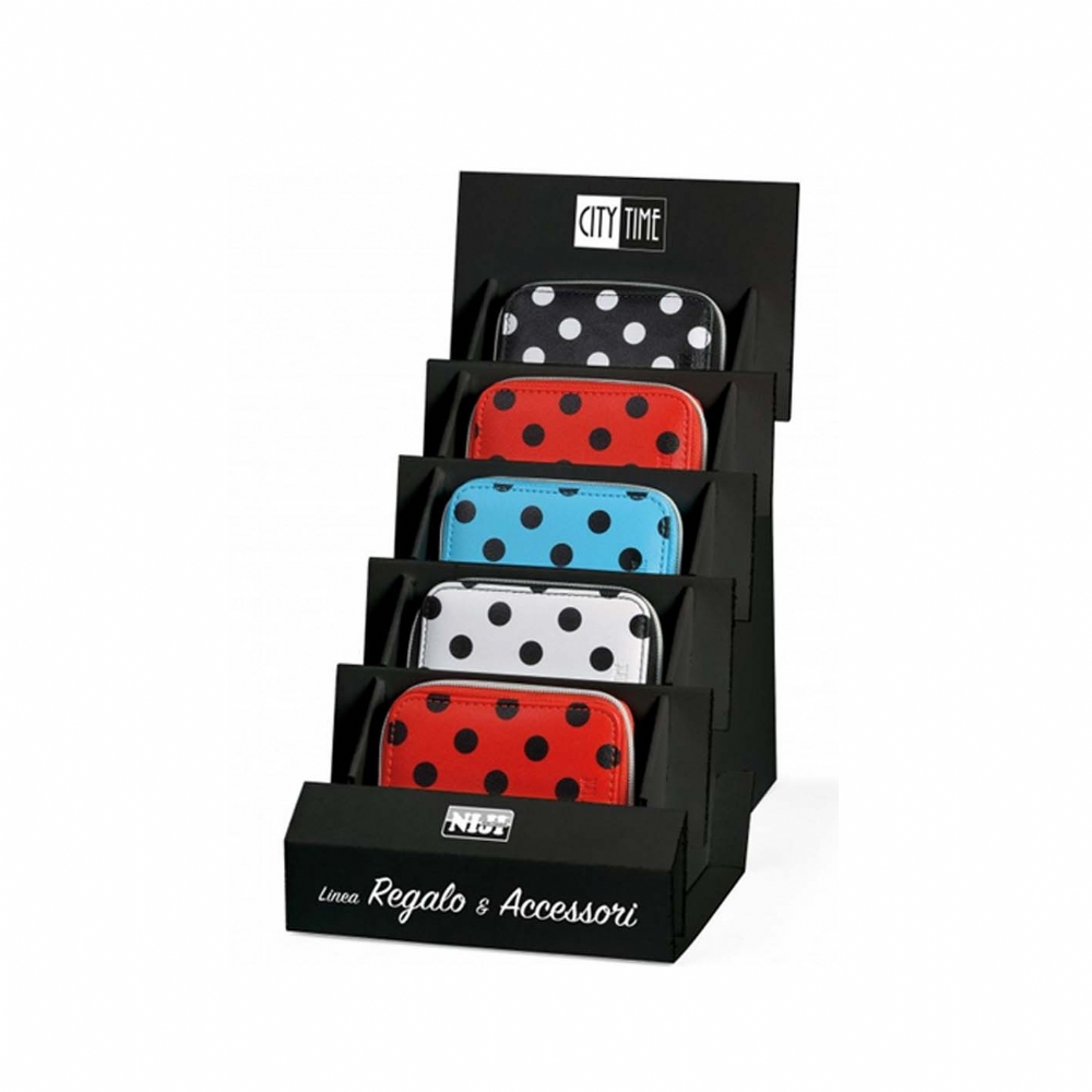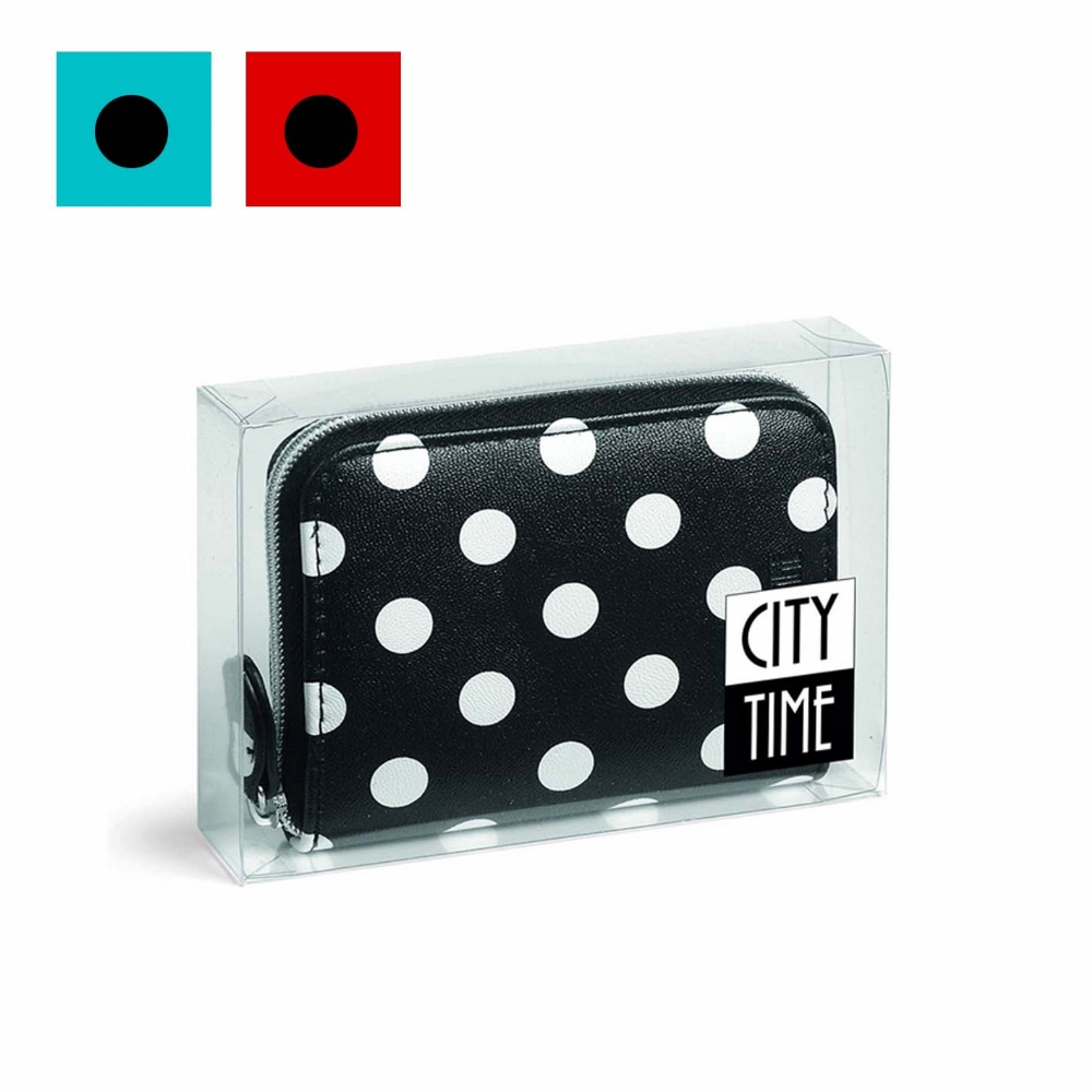 Mini portafoglio da donna Niji City Time. Apertura a libro con zip. All'interno: una taschina con zip per le monetine, 6 bustine trasparenti per tessere, bigllietti da visita e bancomat, 3 taschine in cui inserire tessere varie- Misure: l.12 x h 9 x p. 1,5 cm circa Varianti disponibili: nero pois bianchi - rosso pois neri - azzurro pois neri