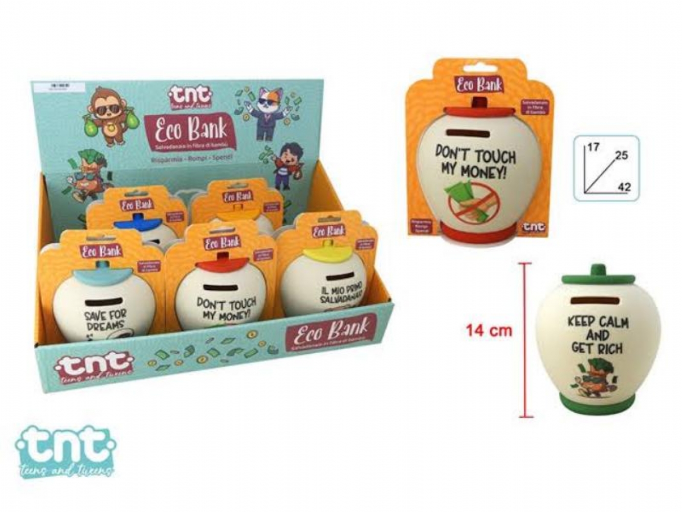 Salvadanaio TNT ECO BANK in Fibra di Bambu 14 CM Il salvadanaio "TnT Eco Bank" è realizzato interamente in fibra di bambù, un materiale naturale ed ecologico. Progettato per contenere monete e banconote in modo pratico e sicuro. Non ha un'apertura riutilizzabile, quindi per accedere al contenuto è necessario romperlo. Ideale per incentivare il risparmio e come oggetto regalo. Colori Assortiti