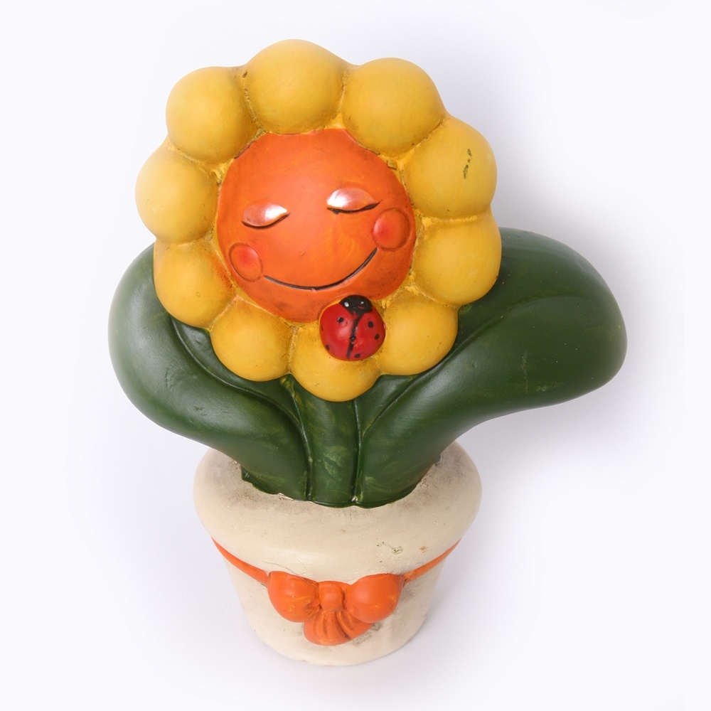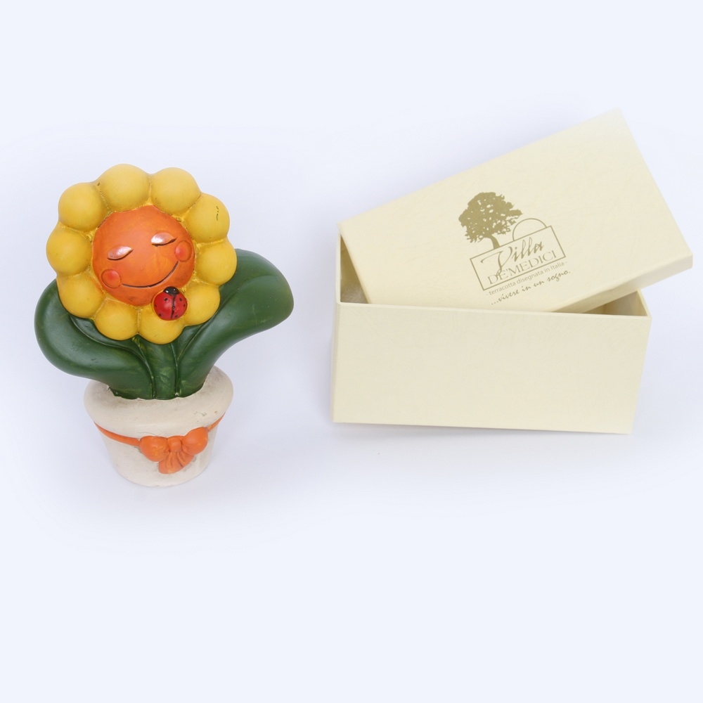 Soprammobile in terracotta disegnata in Italia, Villa De Medici, confezionato nella scatola firmata.Vasetto di girasole con coccinella.Misure: h. 17 cm - l. 13 cm