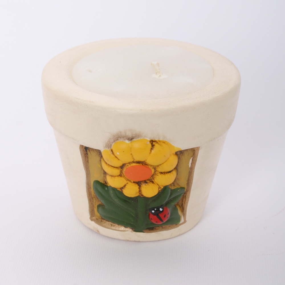 Candela in terracotta disegnata in Italia, Villa De Medici, confezionato nella scatola firmata.Portacandela bianco con decoro girasole.Misure: h. 5,5 cm - d. 7 cm