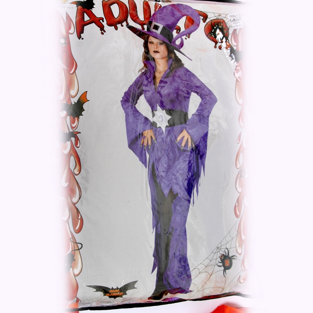 Abito Halloween completo con cappello da Maga o Strega color viola.Taglia unica M.Include: abito lungo, cappello e cintura.