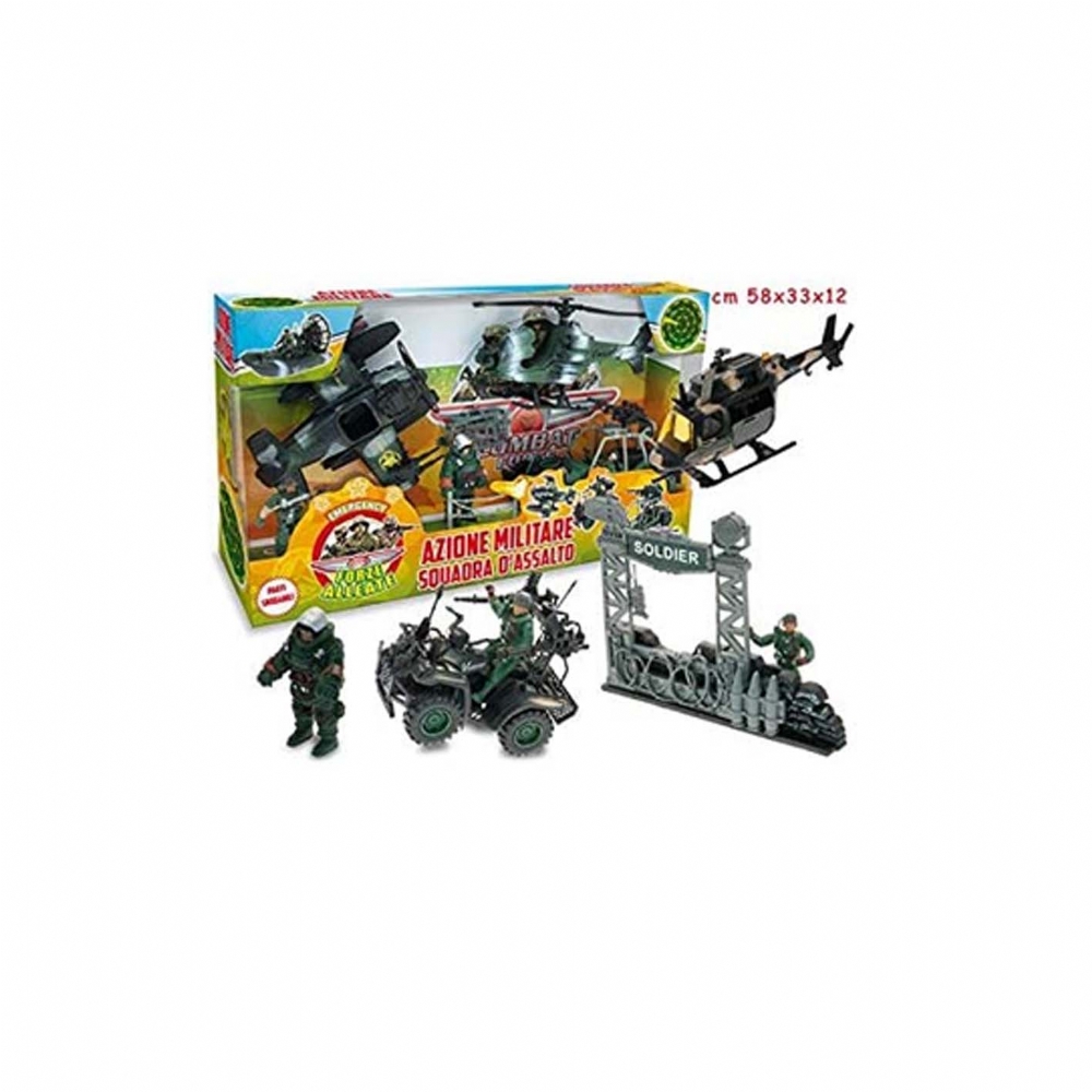 Gioco a tema militare. Squadra d'assalto con soldatini, elicottero, jeeop e base con armi.