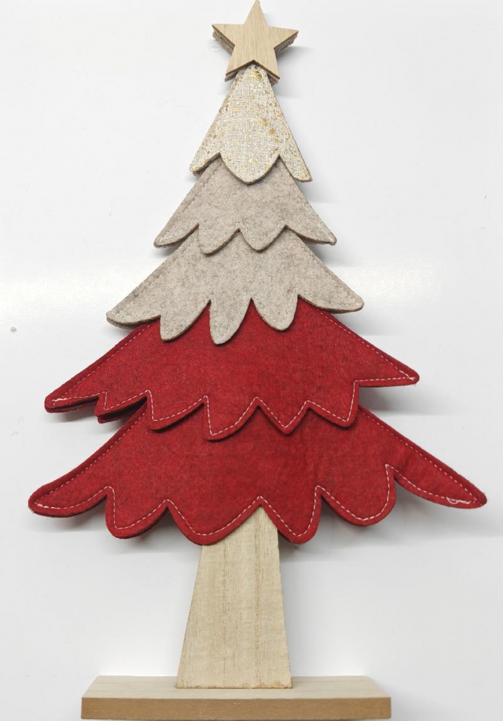 Albero Decorativo Natalizio in Panno Rosso Beige Glitter con Base in Legno 40 cm La chioma dell'albero è formata da strati di feltro o pannolenci in rosso, grigio e beige, cuciti con filo bianco a vista. Sulla punta è posizionata una stella di legno. Questo tipo di decorazione è spesso realizzata a mano e utilizzata per creare paesaggi natalizi o come centrotavola. |