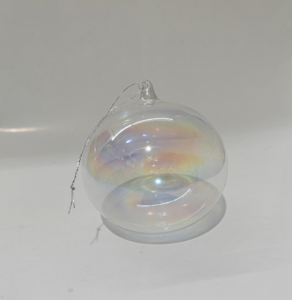 Pallina di Natale Sfera di VetroTrasparente Iridescente 8 cm Sfera di vetro trasparente dal diametro di 8 cm con finitura iridescente, ideale per decorazioni eleganti e sofisticate. Questa sfera aggiunge un tocco di brillantezza e modernità a qualsiasi ambiente. Perfetta per l'uso durante le festività o come elemento decorativo tutto l'anno.