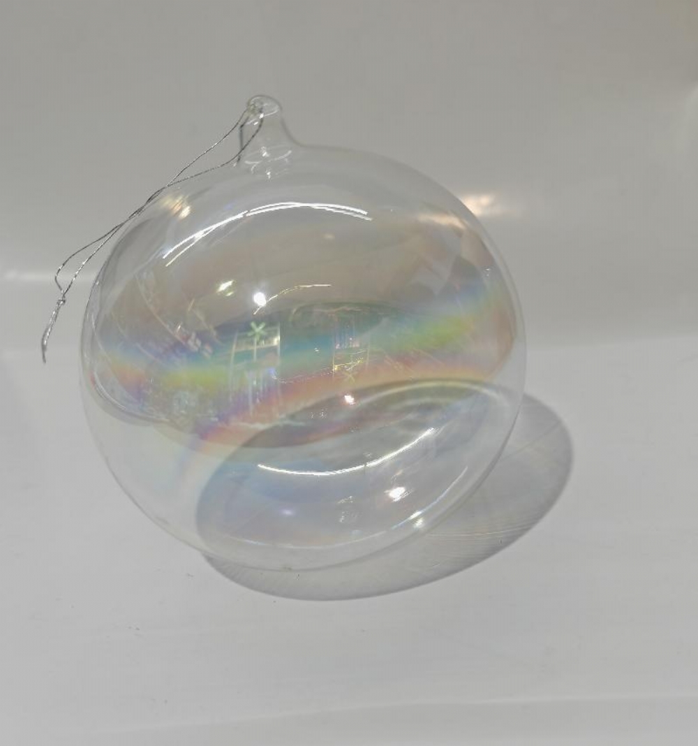 Pallina di Natale Sfera di VetroTrasparente Iridescente 12 cm Sfera di vetro trasparente dal diametro di 8 cm con finitura iridescente, ideale per decorazioni eleganti e sofisticate. Questa sfera aggiunge un tocco di brillantezza e modernità a qualsiasi ambiente. Perfetta per l'uso durante le festività o come elemento decorativo tutto l'anno.