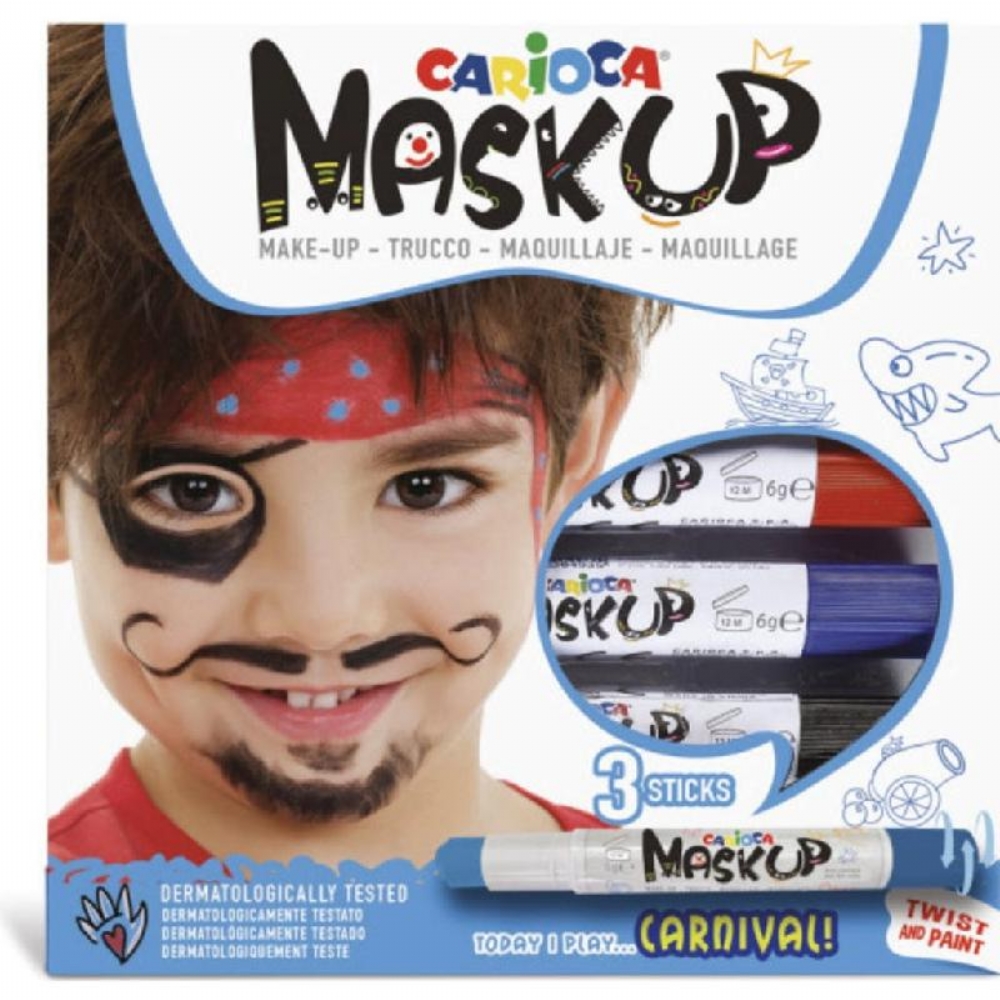 Set 3 Pezzi Trucco Mask Up Carioca Princess Monster Carnival Animals Creepy I nuovi colori per la pelle, gira lo stick e usalo come se fosse una penna. Colori brillanti e lavabili, testati dermatologicamente. I colori si possono mischiare tra di loro, non necessitano di acqua per applicarli sul corpo e possono essere lavati facilmente con acqua e sapone. Colori disponibili: Princess, Monster, Carnival, Animals e Creepy
