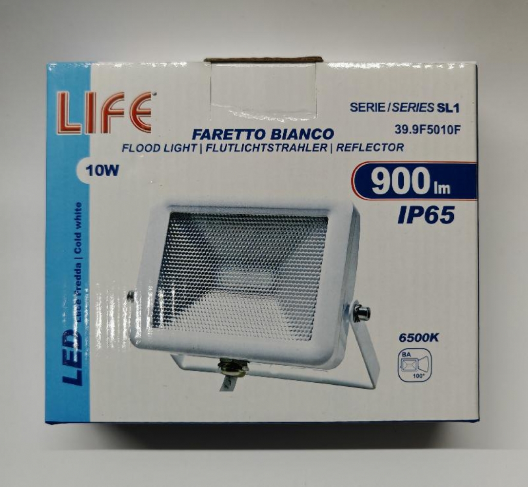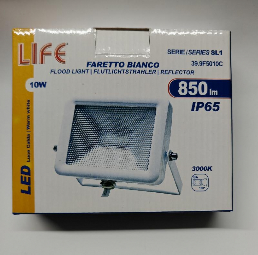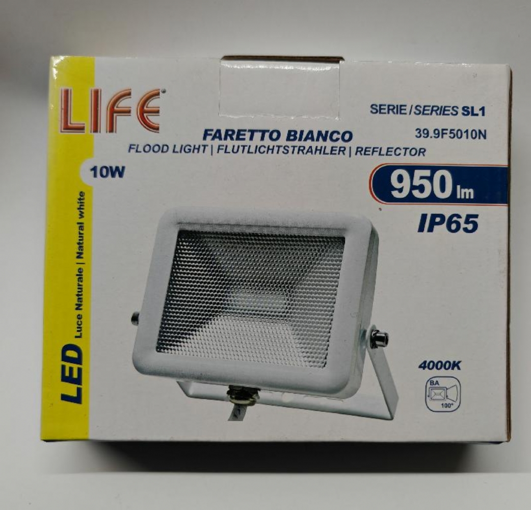 Life 39.9F5010 Faretto Bianco SL1 Led 10W IP65 3000K 4000K 6500K 850lm 900lm 950lm Faretto Bianco LED 10W da esterno IP65. Fascio luminoso BA 100° e flusso luminoso da 850lm, 900lm, 950lm. Disponibile con: Luce Bianca Calda da 3000K - 4000K e luce fredda 6500K. Dimensioni: 31x102x150mm.