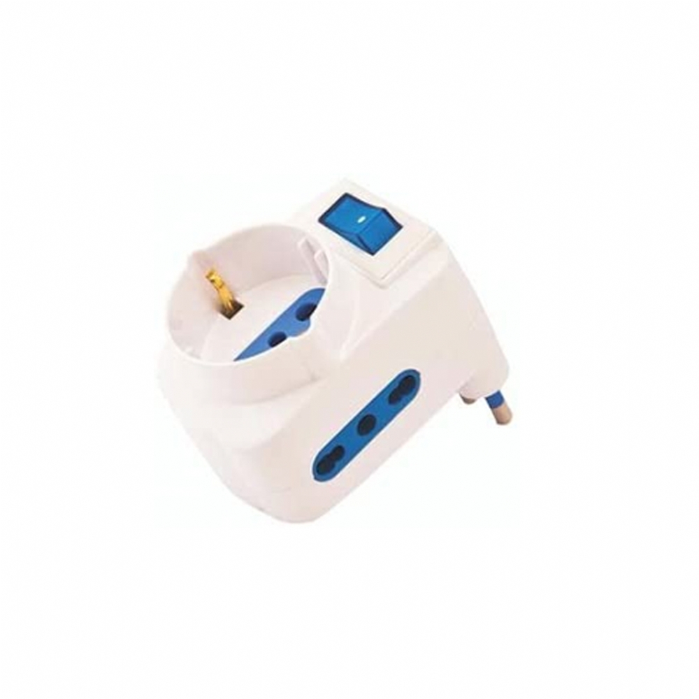 Adattatore rotante con: Spina 16 A, 2 Biprese 10 A 16 A, una bipresa 10, 16 A e tedesca Schuko con interuttore di accensione/spegnimento. L'immagine è solo a scopo dimostrativo. Il prodotto potrebbe cambiare di marca e colore in base alla disponibilità del magazzino
