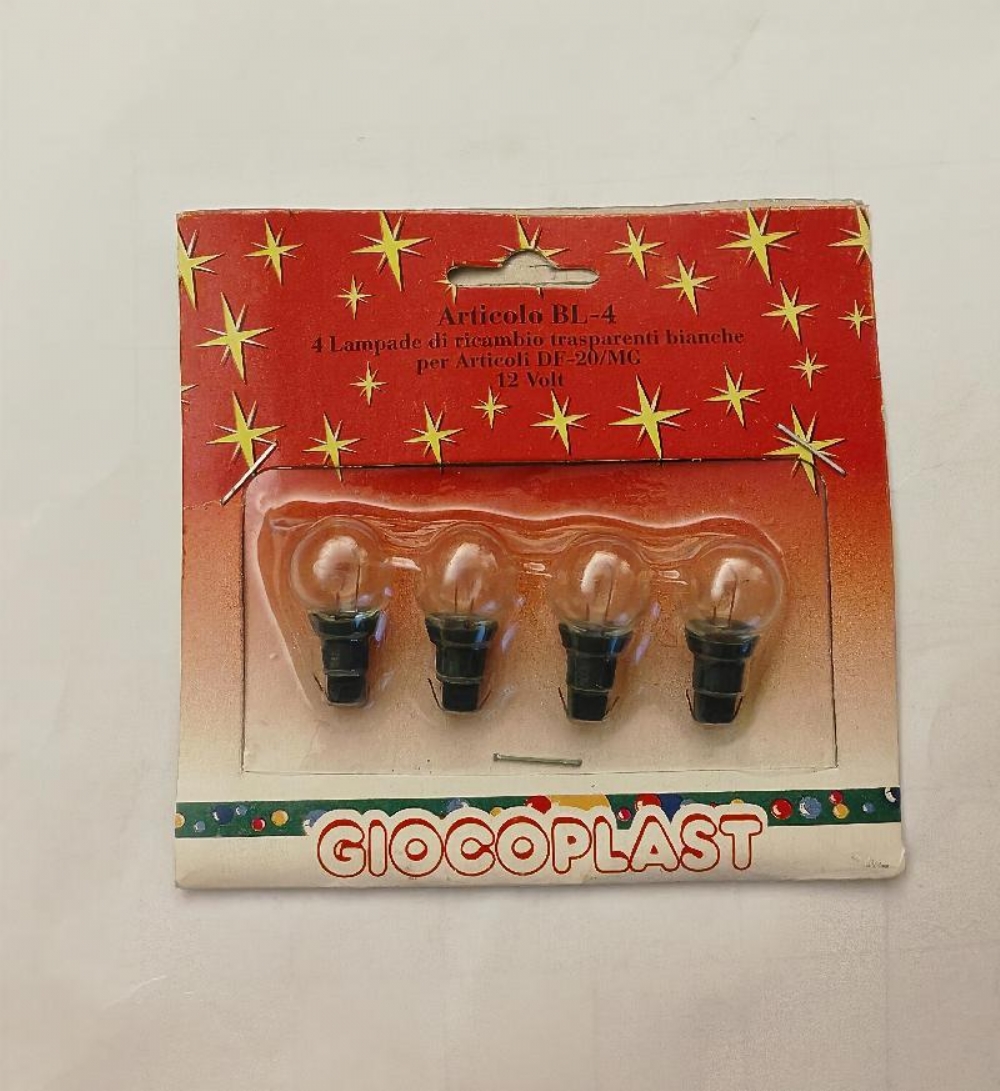 Lampade Ricambio BL-4 12V Incandescenza Luci Natale Presepe 4 Pezzi Colore Bianco Trasparente Set 4 lampade tipo vintage 12V per luminarie, luci, catenarie e serie natalizie. Ottime per sostituzione, ricambi o riparazioni, ogni acquisto si riferisce a numero 4 pezzi lampadine del colore bianco trasparente.
