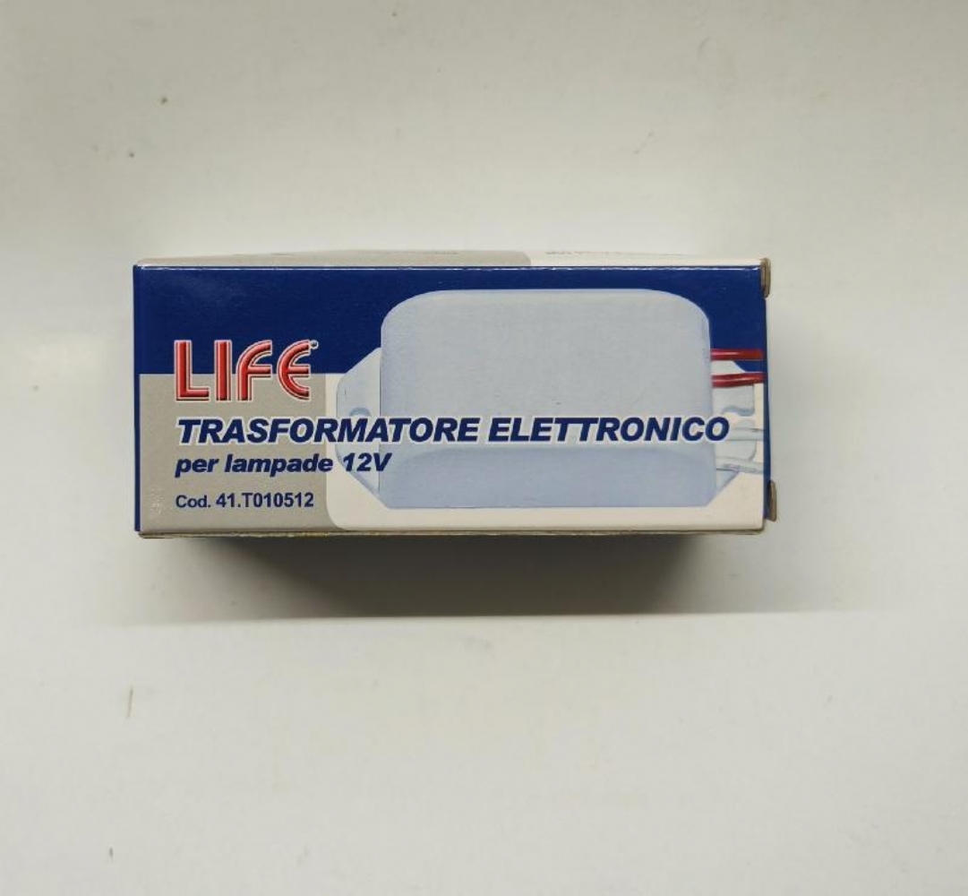 Life 41.T010512 Trasformatore Elettronico per Lampade 12V INPUT 220Vac Trasformatore elettronico per lampade 12V. Funzione: Abbassa la tensione di rete (solitamente 230V) a 12V per l'alimentazione di lampade.
