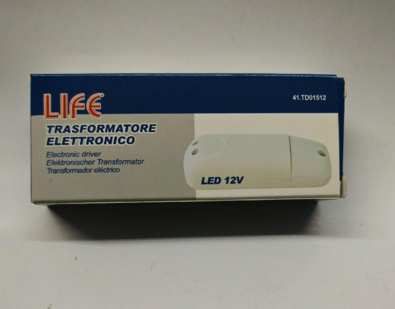 Life 41.TD01512 Trasformatore Elettronico per Lampade Led 12V INPUT 220Vac 14Wmax Trasformatore elettronico per lampade 12V. Funzione: Abbassa la tensione di rete (solitamente 230V) a 12V per l'alimentazione di lampade. Compatibilità: Specifico per lampade a 12V, incluse quelle alogene e a LED (purché compatibili con trasformatori elettronici). Tipologia: Trasformatore elettronico, che risulta più leggero e compatto rispetto ai trasformatori elettromeccanici tradizionali. Dimensioni: 1055x25x40 mm