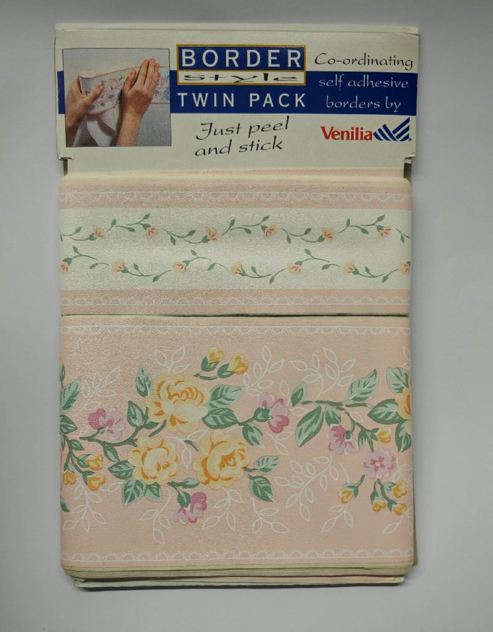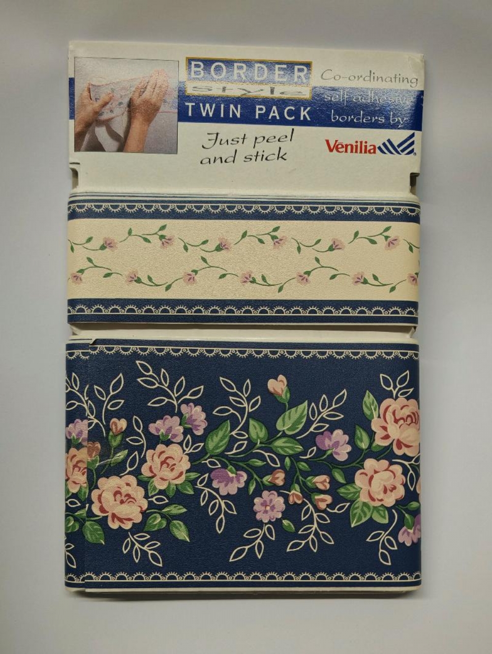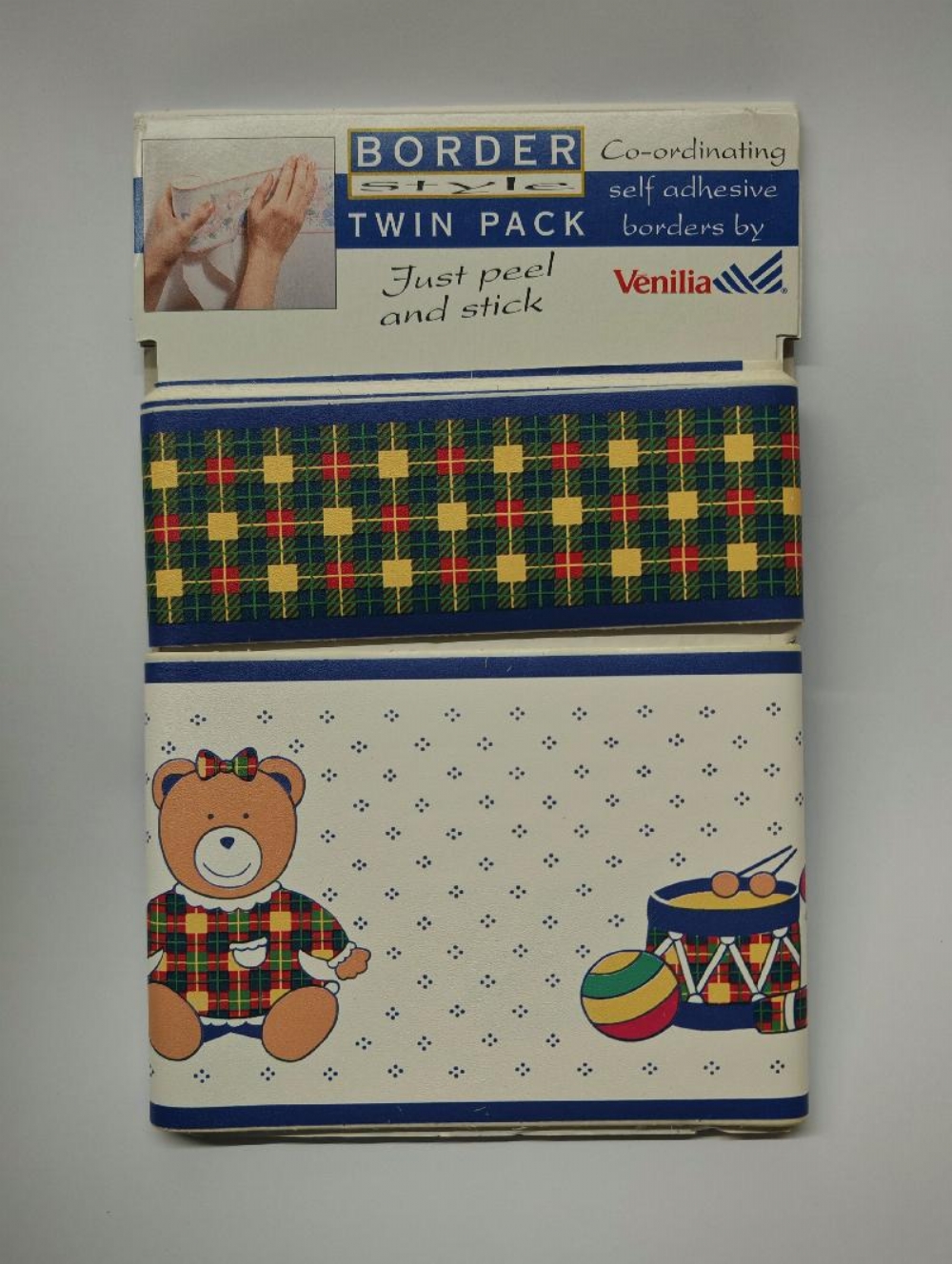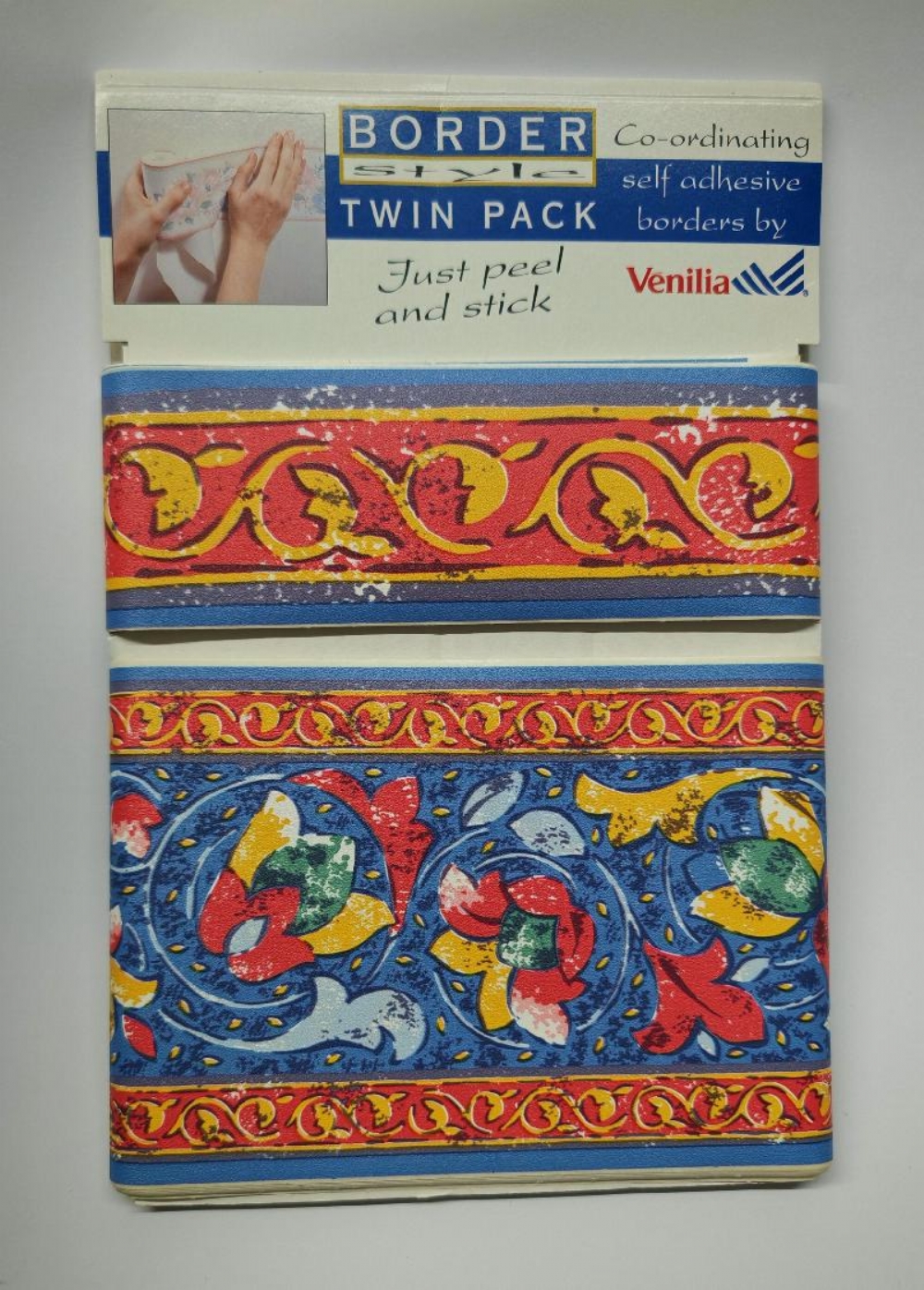 Bordi Decorativi Venilia Autoadesivi Carta da Parati Greche Floreali Geometriche Orsetto Doppio Pacco Altezza 5 e 10cm per 5 metri Pacco doppio di bordi decorativi autoadesivi per carta da parati del marchio Venilia. Design: Presenta due fasce decorative da 5 e 10 cm con greche, orsetti e motivi botanici stilizzati, bordati da linee sottili in rosso, rosa, verde, blu e giallo su fondo blue bianco. Utilizzo: Progettata per essere applicata lungo le pareti per arricchire l'estetica degli ambienti. Stile: Ricorda le decorazioni tipiche della ceramica mediterranea o dello stile "Arts and Crafts".. Disponibilità: - greca fiori stilizzati rosso giallo azzurro su sfondo blu - greca fiori rosa vuola su sfondo bianco - greca fiori rosa violetto su sfondo blu - greca fiori gialli fuxia su sfondo rosa - greca orsetto forme geometriche con tamburi su sfondo bianco