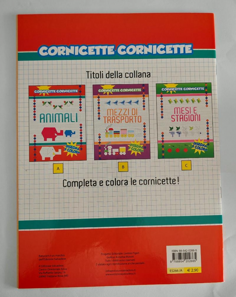 Cornicette Cornicette Animali Disegna e Colora Copertina Flessibile Baby Cart Salvadeos Questo è un libro didattico per bambini intitolato "Cornicette Cornicette - Animali" pubblicato da Edizioni Baby Cart, utilizzato per sviluppare la coordinazione oculo-manuale e la precisione nel tratto grafico. Il libro contiene disegni geometrici e greche basati su quadretti da riprodurre e colorare. Aiuta i bambini a prendere confidenza con la gestione della matita e la spazialità del foglio a quadretti. Include motivi decorativi raffiguranti animali come elefanti, utili per abbellire le pagine dei quaderni. Editore: Baby Cart Salvadeos Lingua : Italiano Collana: Cornicette Cornicette Lunghezza stampa : 16 pagine ISBN: 8854202665 EAN :9788854202665 Copertina : Flessibile Stato del Prodotto: Nuovo |