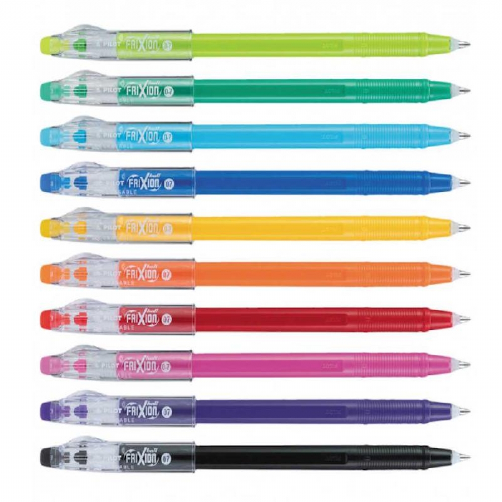 Frixion Ball Pilot 0,7mm penna in chiostro liquido gel cancellabile richiudibile con tappo. Con gomma incorporata. Colori:Blu Rossa Nera Lilla Giallo Arancione Verde Azzurro Rosa