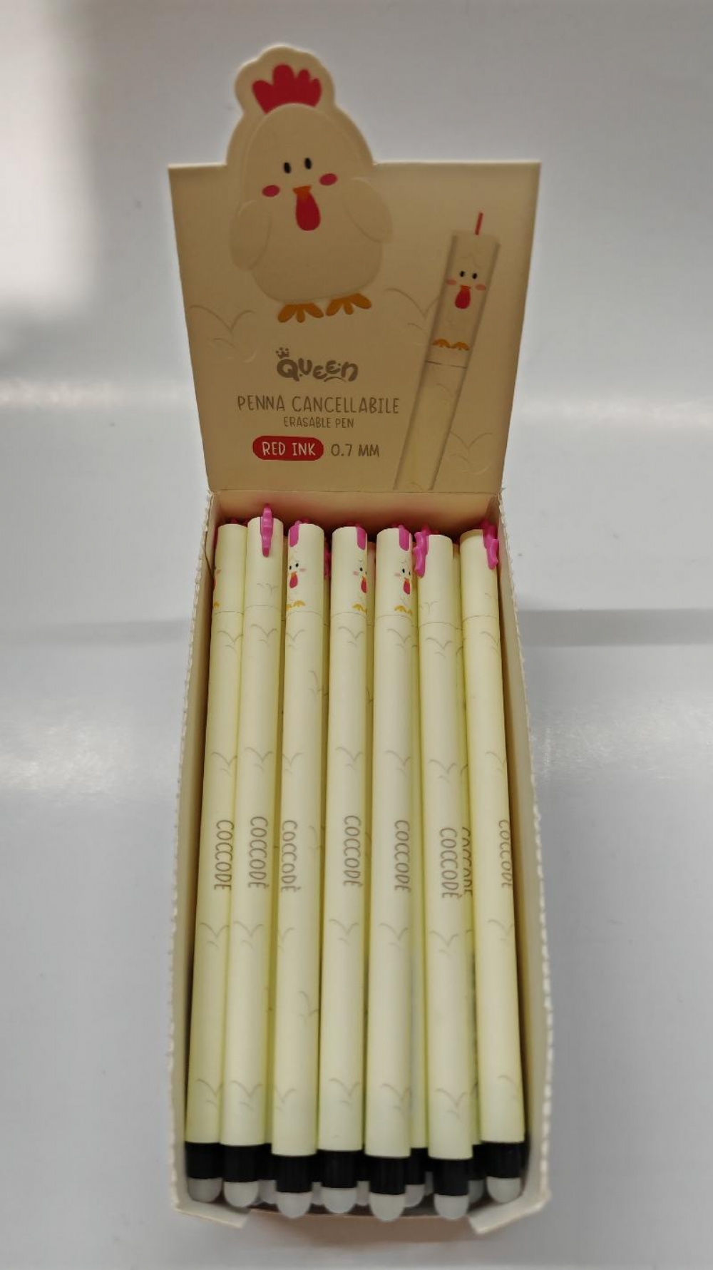 Penna Queen Coccode Sfera Gel Cancellabile con Gommino per Cancellare Inchiostro Rosso 0,7 mm Si tratta di penne a sfera cancellabili con inchiostro rosso termosensibile Presentano un gommino integrato nel top per cancellare senza rovinare la carta |