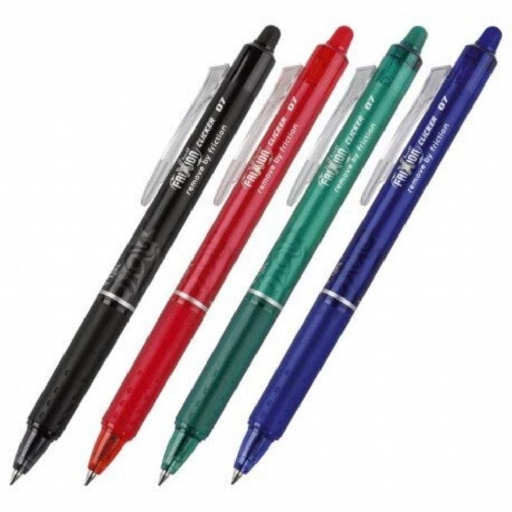 Penna a inchiostro liquido, gel CANCELLABILE richiudibile con clip.Con gomma incorporata.Colori:Blu Rossa Nera Verde
