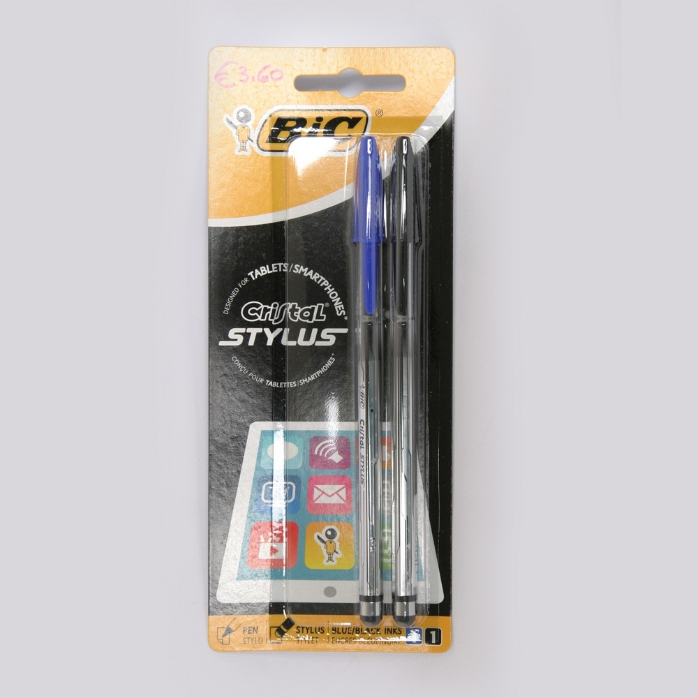Blister di due Penne Bic a sfera, modello Cristal Stylus, punta media con retro per Touch screen. Diventa una penna utile per tablet e smartphone, grazie al pad sul retro utilizzaile per la scrittura su schermi touch.