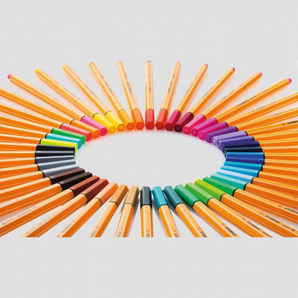Pennarello Fineliner STABILO point 88 punta 0,4 Colore Pastello e Fluorescente Assortiti. La punta sottile 0,4 sottile rinforzata in metallo garantisce grande resistenza ed una lunga durata.Colori delicati perfetti da utilizzare per appunti, bozzetti, hand lettering ed anche con squadre e righelli. Inconfondibile fusto esagonale con strisce bianche longitudinali. Colori: - nero (46) - verde terra (63) - verde turchese (53) - verde smeraldo (36) - verde foglia (43) - verde chiaro (33) - verde ghiaccio(13) - verde fluorescente (033) - grigio scuro (96) - grigio freddo chiaro (94) - marrone (45) - ocra scuro (89) - giallo (44) - giallo fluorescente (024) - arancione (54) - rosso scuro (50) - rosso (40) - rosso fluorescente (040) - rosa scuro (56) - rosa fluorescente (056) - albicocca (26) - lilla (58) - lilla chiaro (59) - viola (55) - azzurro (57) - blu oltremare (32) - blu turchese (51) - blu (41) - blu di Prussia (22)