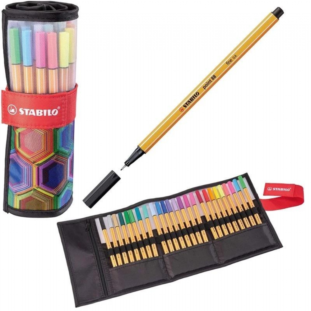 Pennarello Fineliner STABILO point 88 punta 0,4 Colore Rotolo 25 Colori Arty Line Rotolo Fineliner Point 88 Arty Line Stabilo Rotolo in nylon dotato di finestra trasparente e chiusura in velcro Scomparto interno con cerniera 25 colori assortiti di cui 5 colori fluorescenti Fusto esagonale Supporto della punta in metallo per garantire una grande resistenza Tratto di 0.4 mm Adatto per lavorare con righelli, squadre e stencil Dura a lungo anche senza cappuccio Cappuccio ventilato anti soffocamento