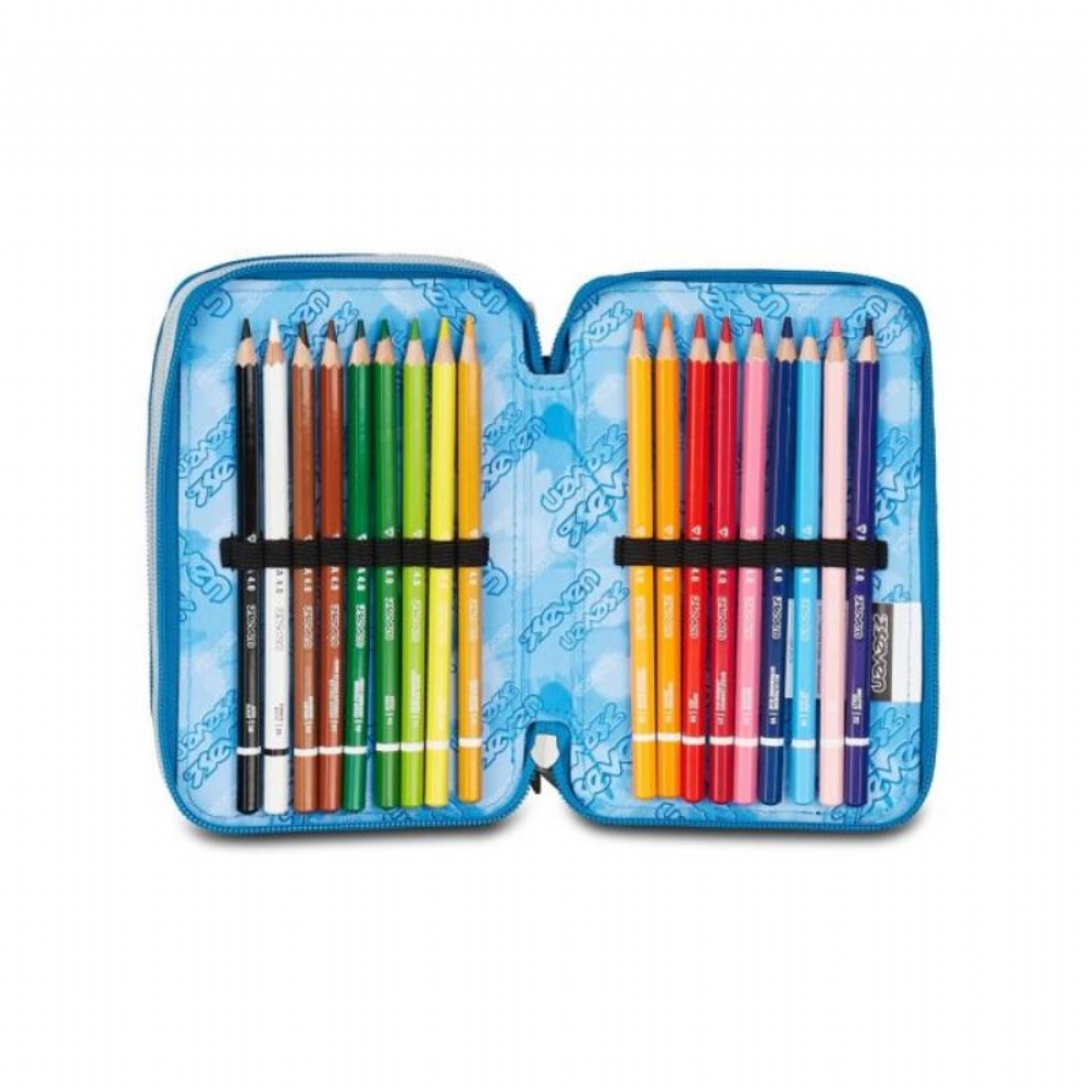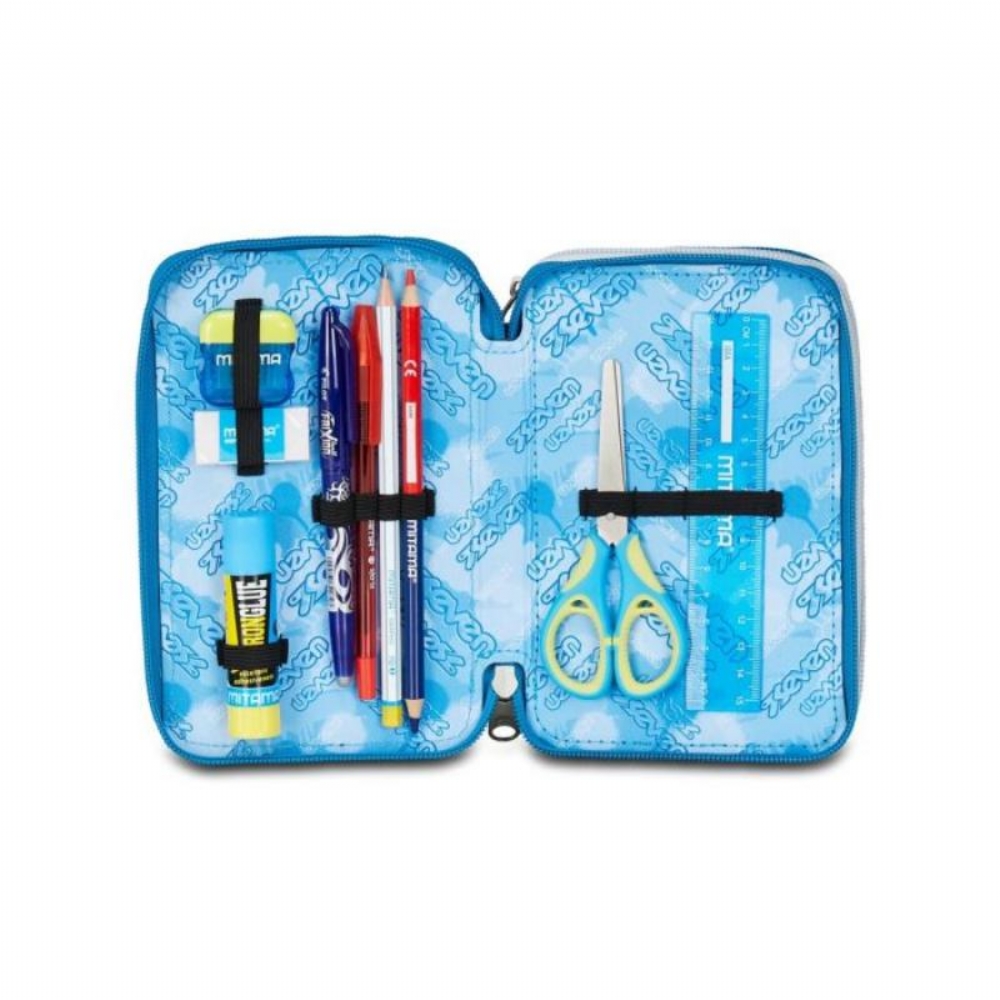 Seven Astuccio 3 zip Quick Graffiti Boy 2026 completo di materiale. Questo astuccio Seven 3 zip ha tre scomparti in cui troverai tutto il materiale necessario per la tua giornata di scuola. Contiene ben 45 pezzi: 1 penna cancellabile blu, 1 penna sfera rossa, 18 pastelli a colori 4.0 esagonali, 18 pennarelli superlavabili punta 3.0, 1 matita grafi te esagonale HB, 1 colla gialla azzurra, 1 gomma bianca con cartoncino stampato, 1 temperino barilotto 2 fori, 1 righello trasparente, 1 matita bicolor rosso/blu, 1 paio di forbici in metallo. Dimensioni: circa 12,5 x 20 x 7 cm. Tessuto: polyestere. |