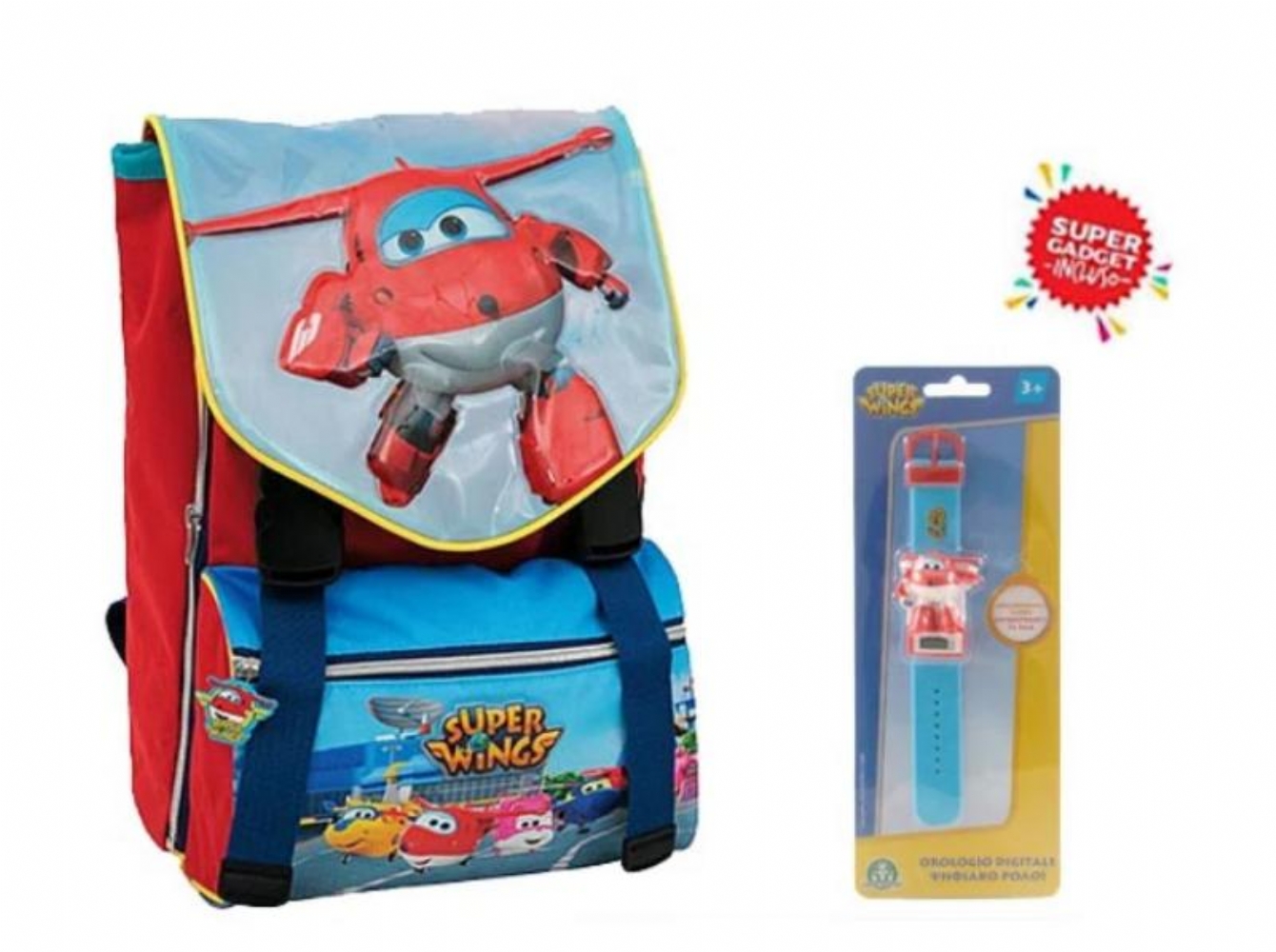 Zaino Super Wings Estensibile è realizzato in tessuto poliestere, con schienale ergonomico e spallacci imbottiti e regolabili, tasca ampia interna con chiusura con fibbie, tasca frontale, dimensioni prodotto: 25x37x (11+6) centimetri circa Ed inoltre insieme allo zaino, subito per te uno speciale Gadget in omaggio. Colore: rosso blu con stampe personaggi |