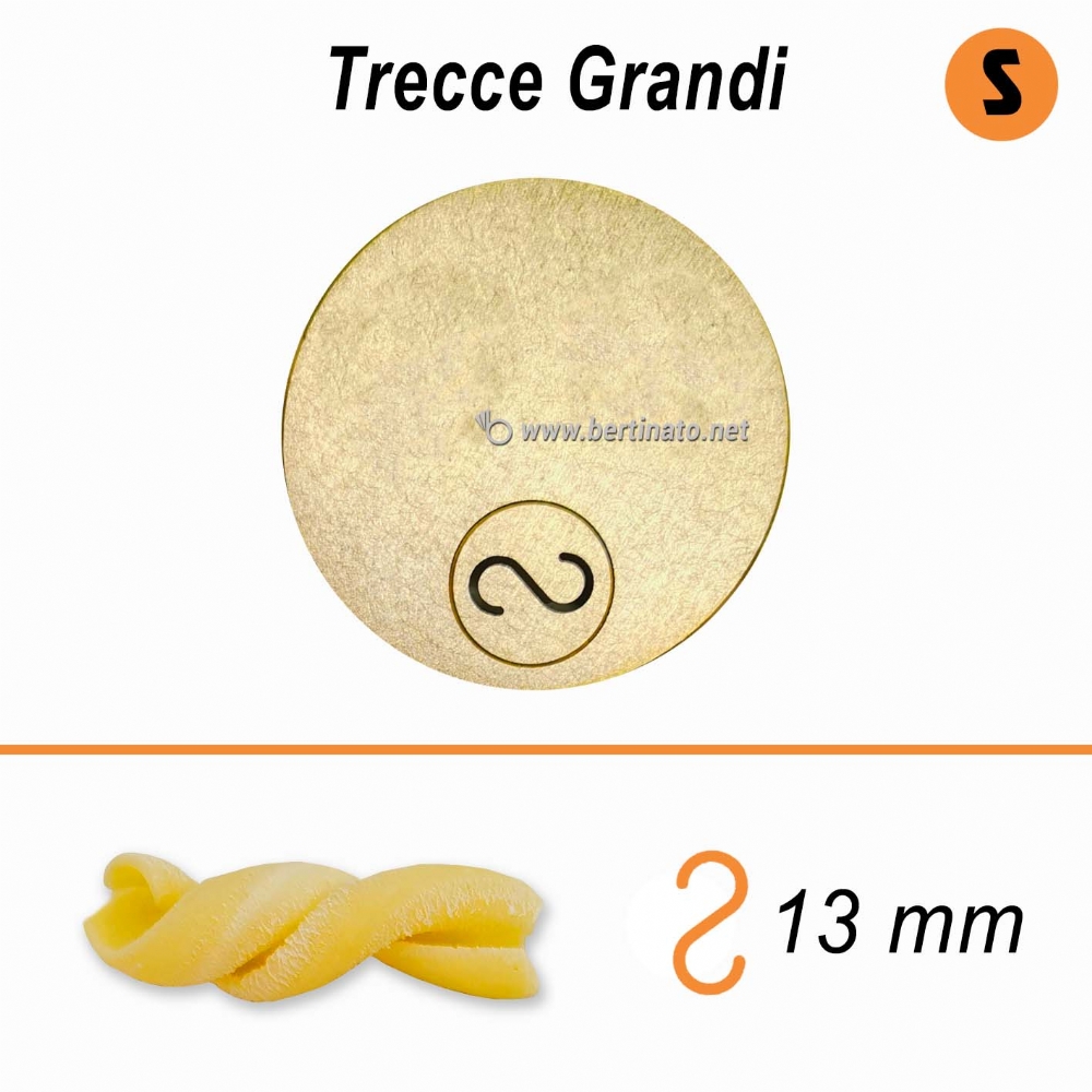 Trafile in bronzo formato trecce o caserecce grandi giganti per le macchine per fare la pasta La Fattorina.Grandezza treccia: 14mm circa.Diametro esterno trafila: 56mm.Queste sono le trafile disponibili per la macchina per pasta - La FattorinaPRODOTTO MADE IN ITALY. Users outside of Italy, please click here for any info
