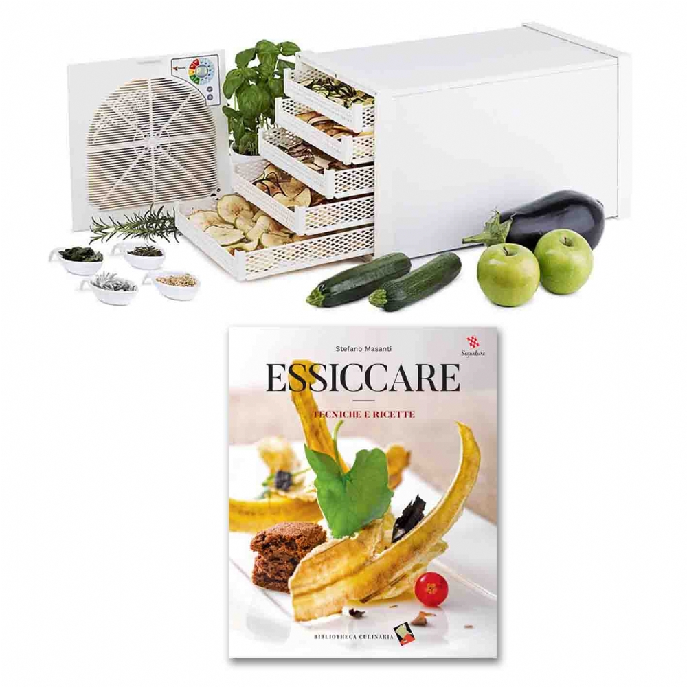 Offerta per Libri Essiccare con ricette e tecniche con gli Essiccatori Biosec Domus B adatti per essiccare alimenti come funghi, frutta, verdura,pasta realizzati in solido materiale plastico adatto per l'uso domestico e professionale. Vi diamo la possibilità di acquistare, oltre all'essiccatore anche il Libro Essiccare dove lo chef Stefano Masanti esamina varie tecniche per privare i cibi della loro naturale umidità. Nel ricettario vengono valutati i risultati prodotti da strumenti diversi come: il forno tradizionale, il forno a microonde e l'esiccatore e vi offre una gamma di ricette per dimostrare come ingredienti essiccati possono avere ruoli sorprendenti in piatti d'autore. Grazie a questo libro potrete fin da subito sperimentare ricette sfiziose con l' EssiccatoreBiosec Domus B5 che è perfetto per chi cerca un essiccatoio per uso domestico di piccole dimensioni, efficente e conveniente. Infatti l'essiccatore Biosec Domus è il più pratico, leggero ed economico essicatore della linea Biosec prodotta dalla Tauro Essicattori, esclusivamente in Italia. Grazie ai controlli elettronici del sistema Dryset Pro ogni prodotto ha un suo programma di essiccazione ottimizzato e specifico. L'utilizzo è facilissimo, basta infatti caricare i prodotti nei cestelli, selezionare il programma desiderato e Biosec si occupa di essiccare ogni alimento nel modo migliore. Durante il processo di essiccazione si può in ogni momento controllare la temperatura interna, e quando il programma è terminato il sistema Dryset Pro mantiene i prodotti al giusto grado di essiccazione, per tutto il tempo necessario. Quello che rende l'essiccatore Biosec unico è il metodo di essiccazione a flusso d'aria orizzontale. L'aria è libera di circolare lungo tutta la superficie dei prodotti, rendendo l'essiccazione uniforme e ottimizzando lo sfruttamento del calore. I modelli Biosec Domus, pur essendo i nostri essicatori più economici, vengono forniti con lo stesso gruppo motore di tutti gli altri modelli, e quindi con opzioni e programmi identici ai suoi fratelli maggiori.
