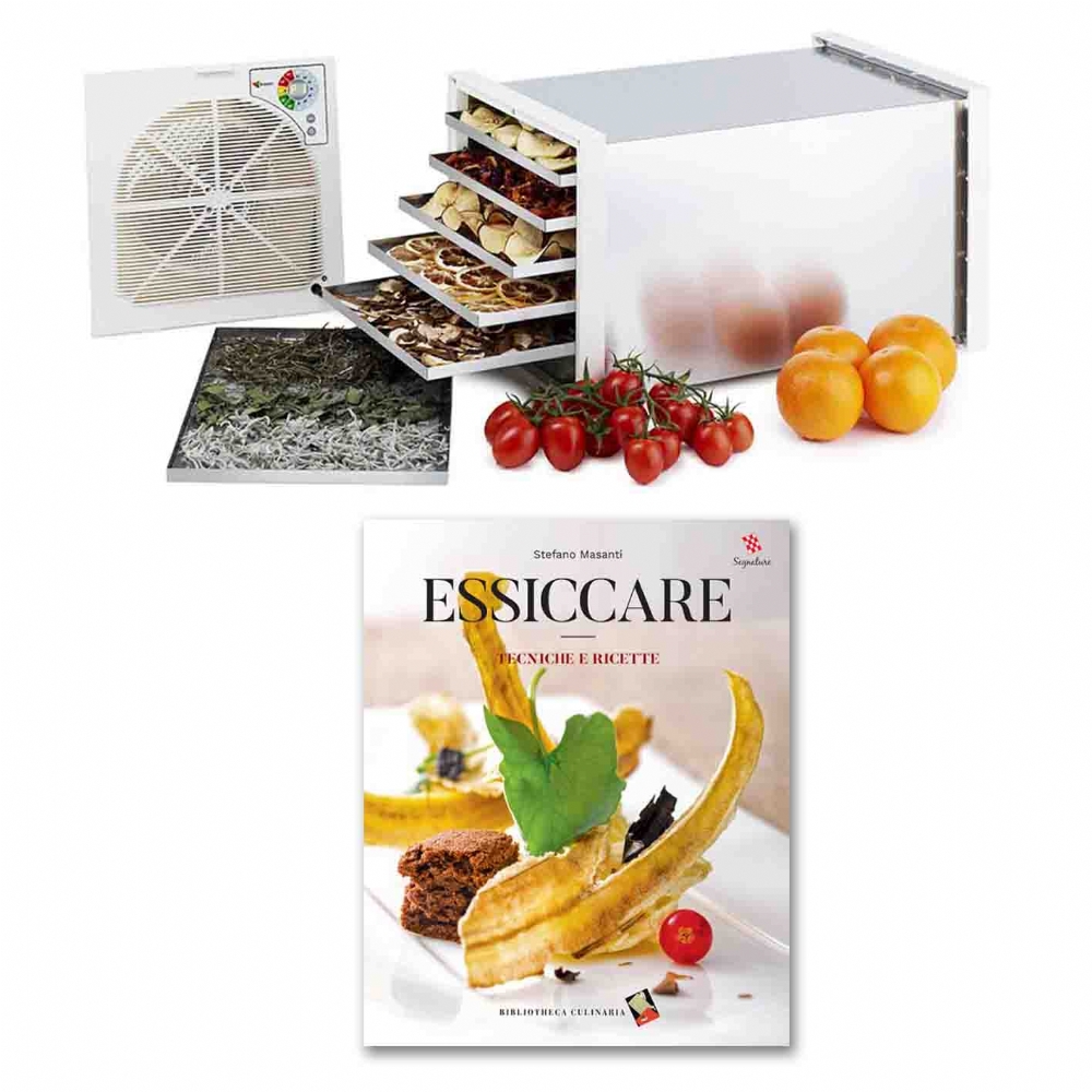 Il Migliore Prezzo per i Libri con Ricette e Tecniche Essiccare fornito con gli Essiccatori in acciaio inox Biosec De Luxe B6 ideale per essiccare Pasta Fresca Frutta Verdura Carne Pesce Funghi Erbe Aromatiche Officinali. Vi diamo la possibilità di acquistare, oltre all'essiccatore anche il Libro Essiccare dove lo chef Stefano Masanti esamina varie tecniche per privare i cibi della loro naturale umidità. Nel ricettario vengono valutati i risultati prodotti da strumenti diversi come: il forno tradizionale, il forno a microonde e l'esiccatore e vi offre una gamma di ricette per dimostrare come ingredienti essiccati possono avere ruoli sorprendenti in piatti d'autore. Grazie a questo libro potrete fin da subito sperimentare ricette sfiziose con l'Essiccatore Biosec De Luxe che si rivolge agli utenti