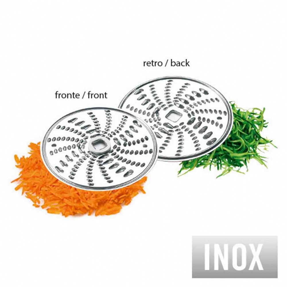 Pratiche Grattugie manuali Rigamonti art. 32 a manovella in poliammide 66, con tre dischi in acciaio inox adatti per grattuggiare formaggio parmigiano e formaggi a pasta dura, per tagliare verdure alla julienne come zucchine, carote, patate oppure per tagliare a tondino o a bastoncino. Questa grattugia multiuso Super Shred 2000 è costruita interamente in Italia ed è dotata di ventosa in gomma caucciù con movimenti del gruppo ventosa in poliammide 66. I 3 dischi in acciaio inox 18/C in dotazione permettono di fare cinque diverse operazioni di taglio. La grattugia è facilmente smontabile per permettere una facile pulizia e tutti i suoi componenti possono essere lavati in lavastoviglie. |